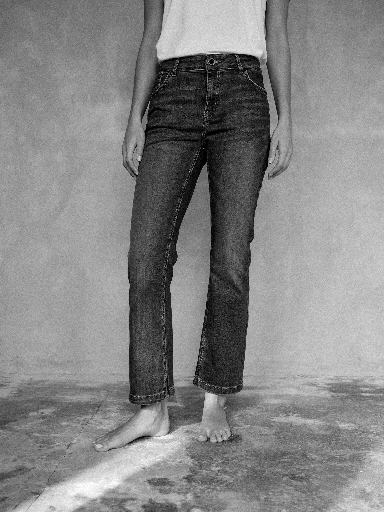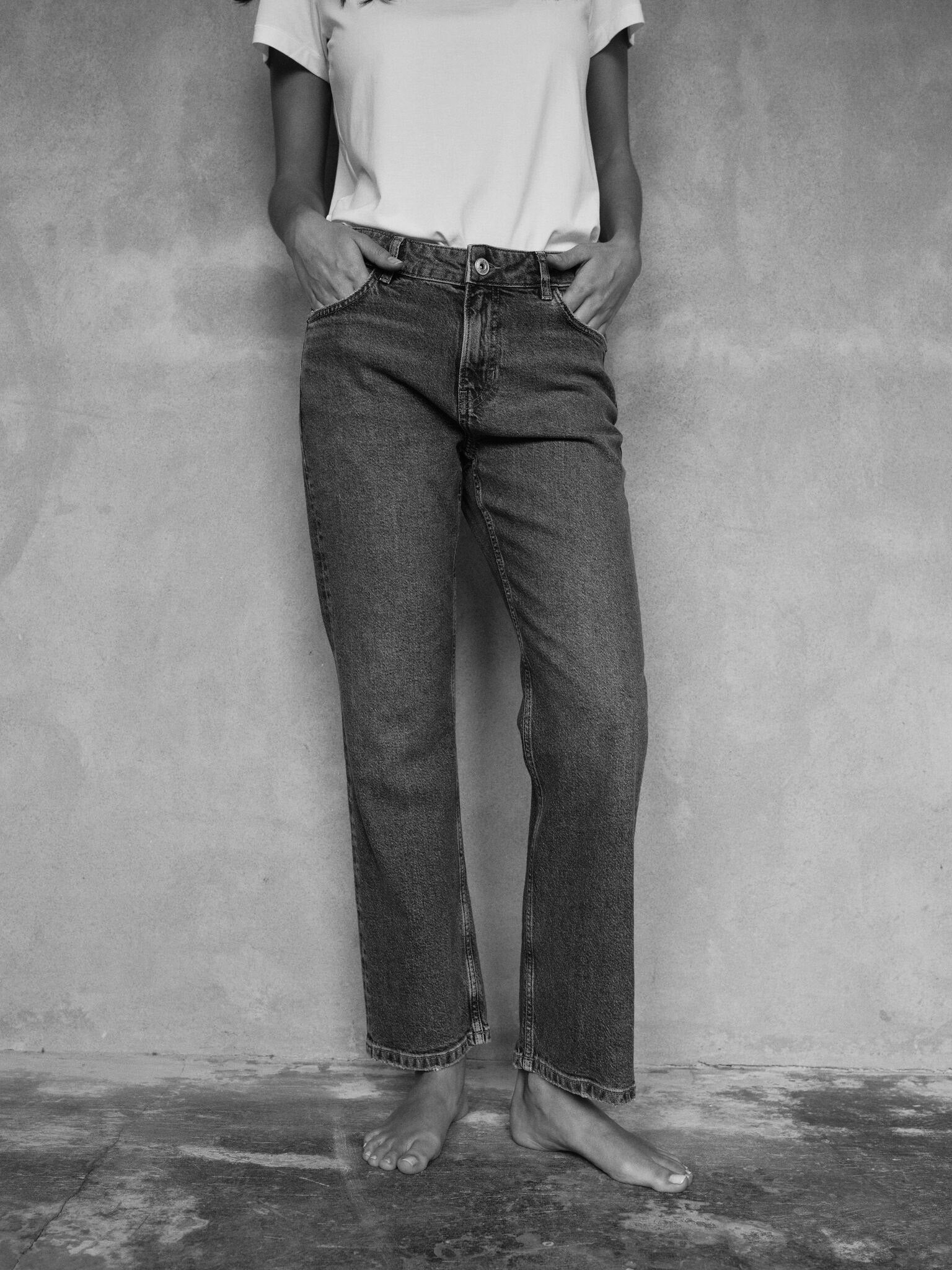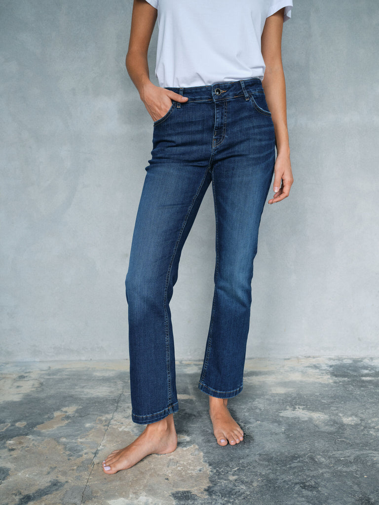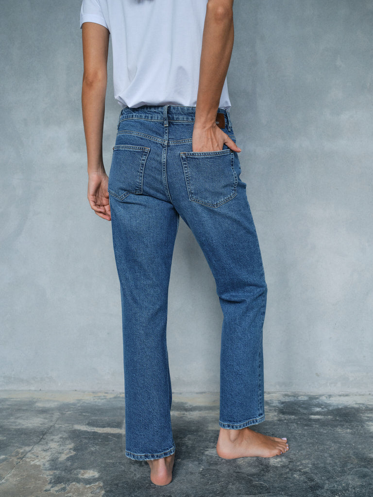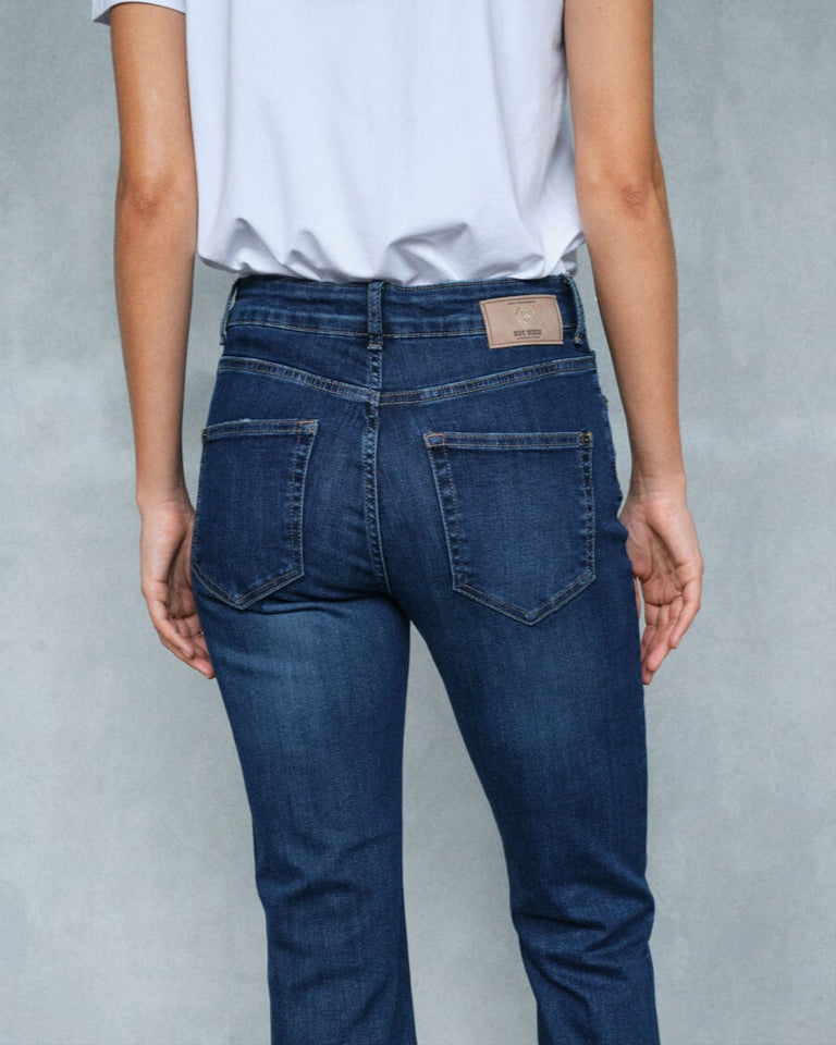 Straight fit jeans er designet med lige ben, der opretholder samme bredde fra hofterne ned til kanten. Denne ensartede bredde skaber et slankt, afbalanceret look, der er flatterende for alle kropstyper. Uanset din kropsform skaber straight jeans en slankende effekt, der fremhæver benenes naturlige linjer uden at være for tætsiddende eller for løse.