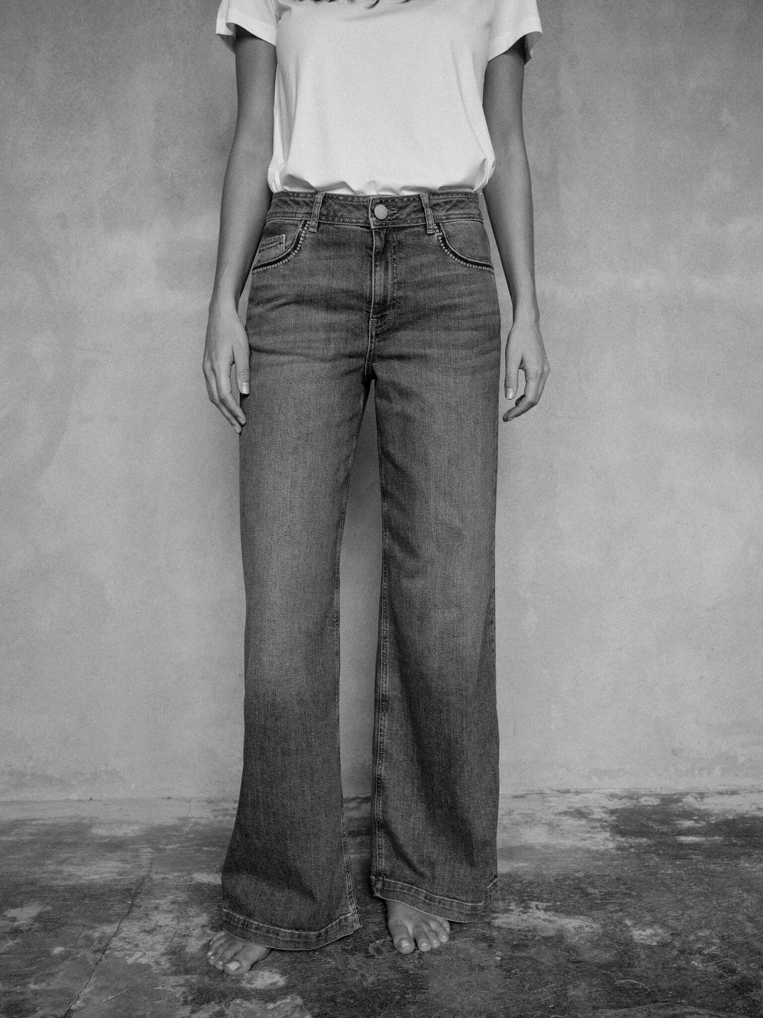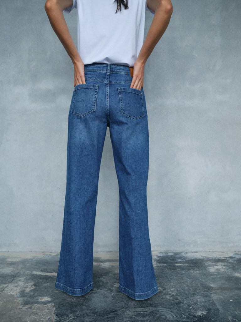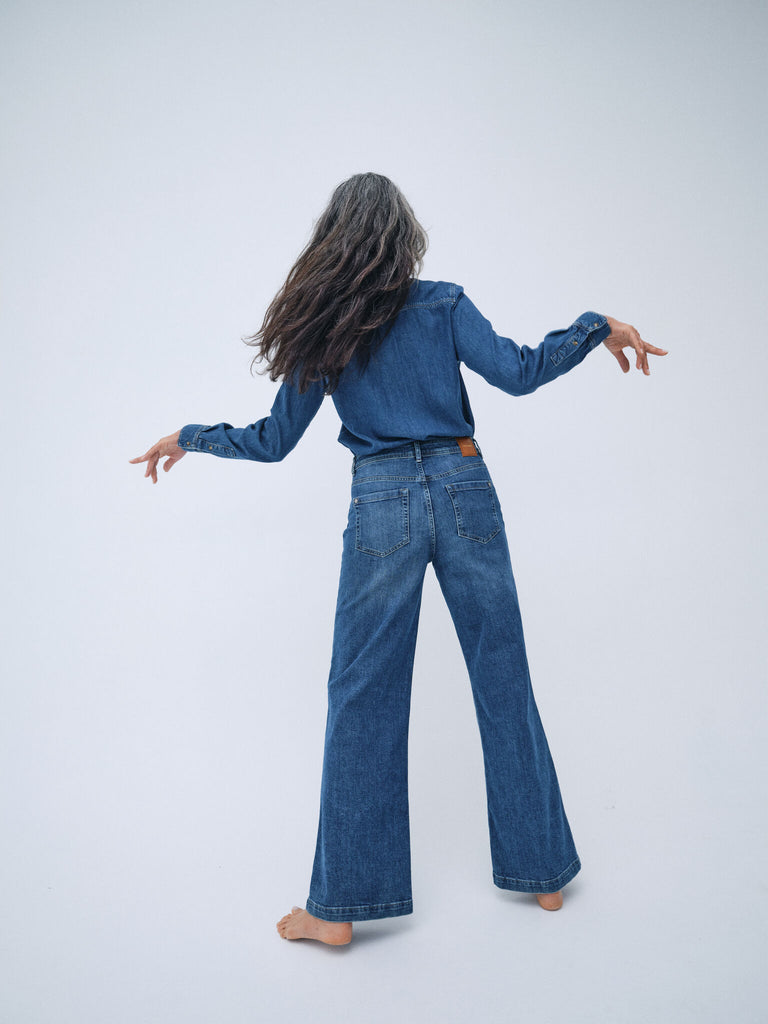 Wide-leg jeans er ideelle for kvinder, der elsker en retro culotte-pasform eller en boxy silhuet. Denne pasform er bredere ved knæene og bunden af benene, hvilket giver en løsere, afslappet pasform, der er både cool og behagelig. Med deres culotte-lignende form skaber wide-leg jeans en illusion af længere ben og fremhæver taljen på en diskret, sofistikeret måde, hvilket gør dem til et flatterende valg for de fleste kropstyper.