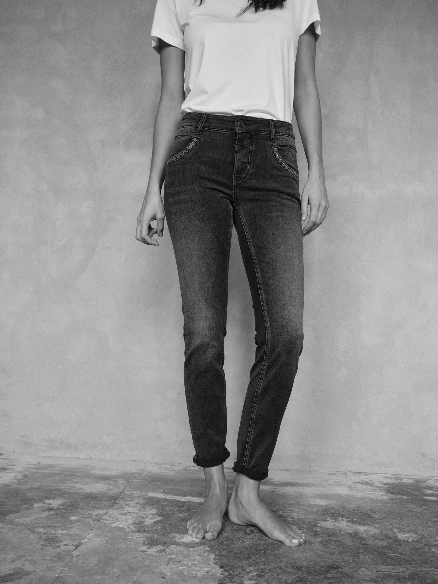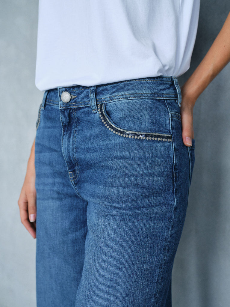 Regular fit jeans har et afslappet æstetisk look med en tapered pasform omkring benene, der giver god støtte samtidig med, at de sikrer en komfortabel pasform uden at være for stramme omkring lårene. Disse jeans sidder komfortabelt omkring hofter og lår og bliver smallere i anklerne, hvilket skaber en balanceret form, der passer til enhver kropstype - især til dig med en kurvet silhuet. De er ofte dekoreret med et strejf af deco-glam for at give ekstra flair til looket.