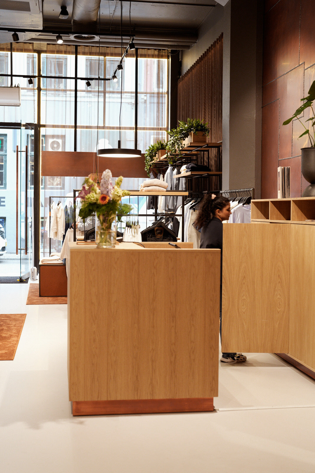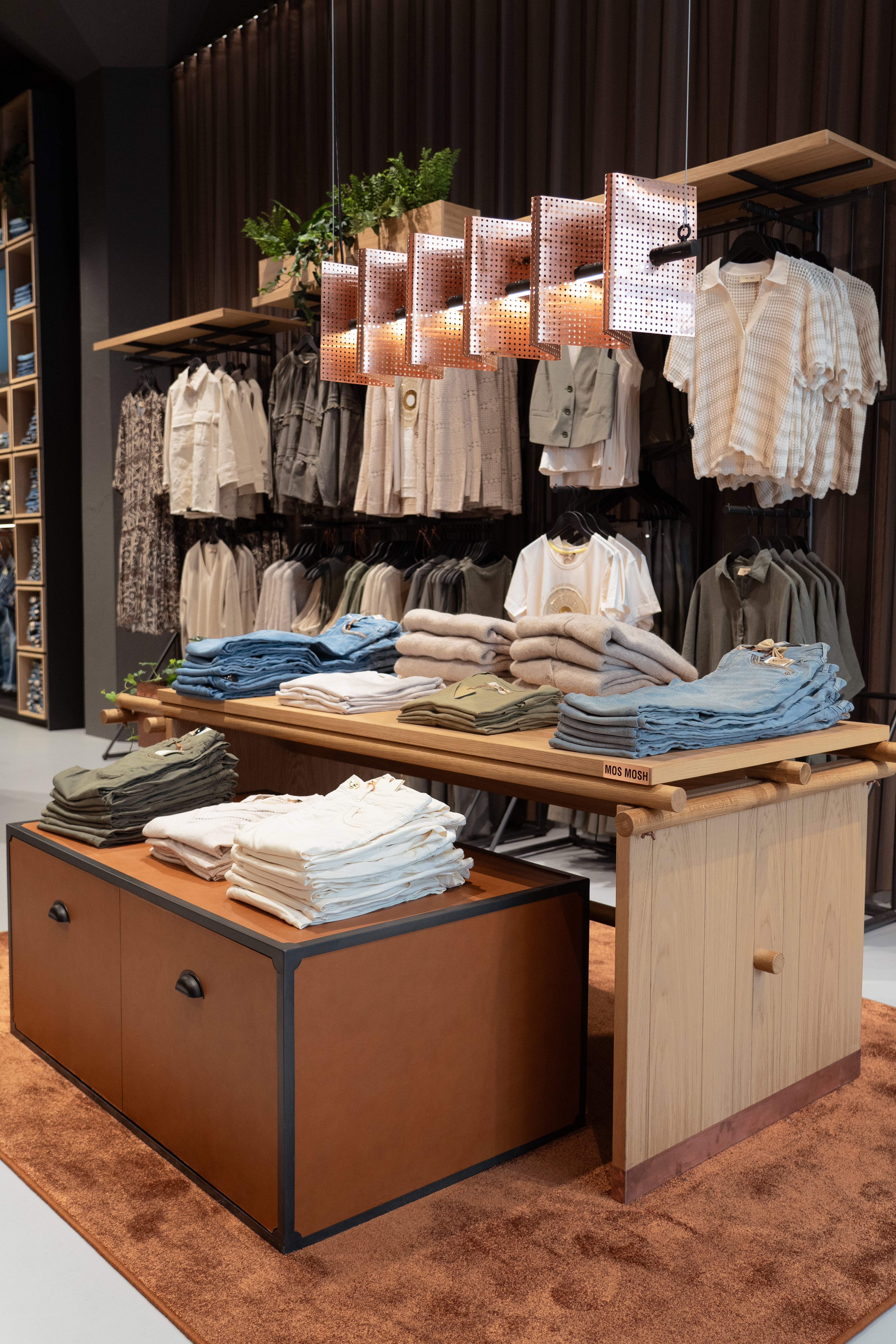 Når du besøger vores MOS MOSH butik i København, kan du opleve meget mere end mode. Indretningen er nøje udvalgt og skabt ud fra simple principper og elegante materialer som læder, kobber, bruneret stål og grønne planter. Resultatet er en stemningsfuld butik,