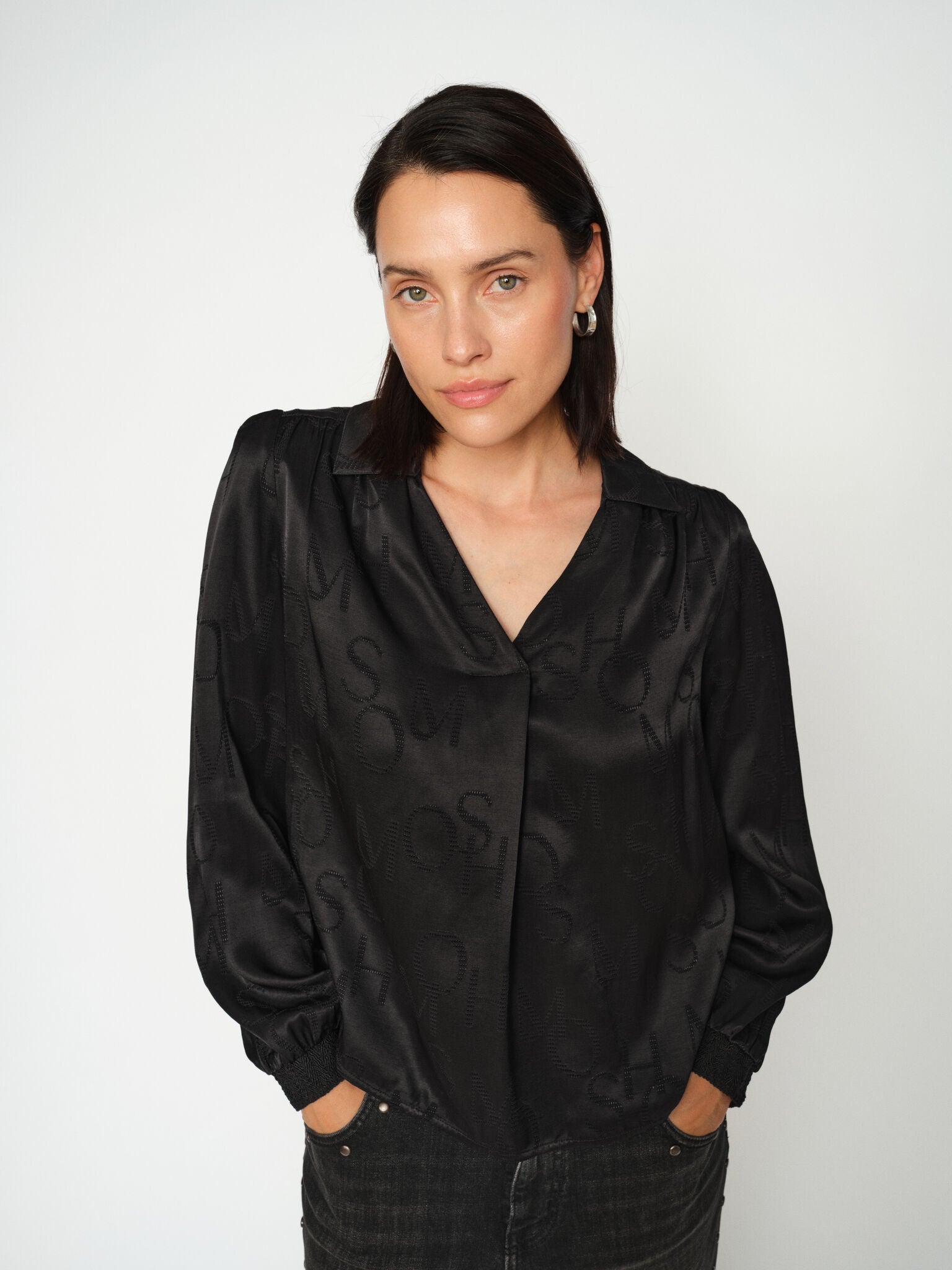 Denne bluse forener tidløs tailoring med et diskret monogram-twist. Den er designet i en let afslappet silhuet med et blødt fald og tone-i-tone MOS MOSH-bogstaver over hele stoffet, hvilket skaber et subtilt, men iøjnefaldende udtryk. Kraven og det slå-om-inspirerede frontparti tilfører elegance, mens de smockede manchetter giver et moderne, feminint touch. Perfekt sammen med højtaljede bukser eller med denim.