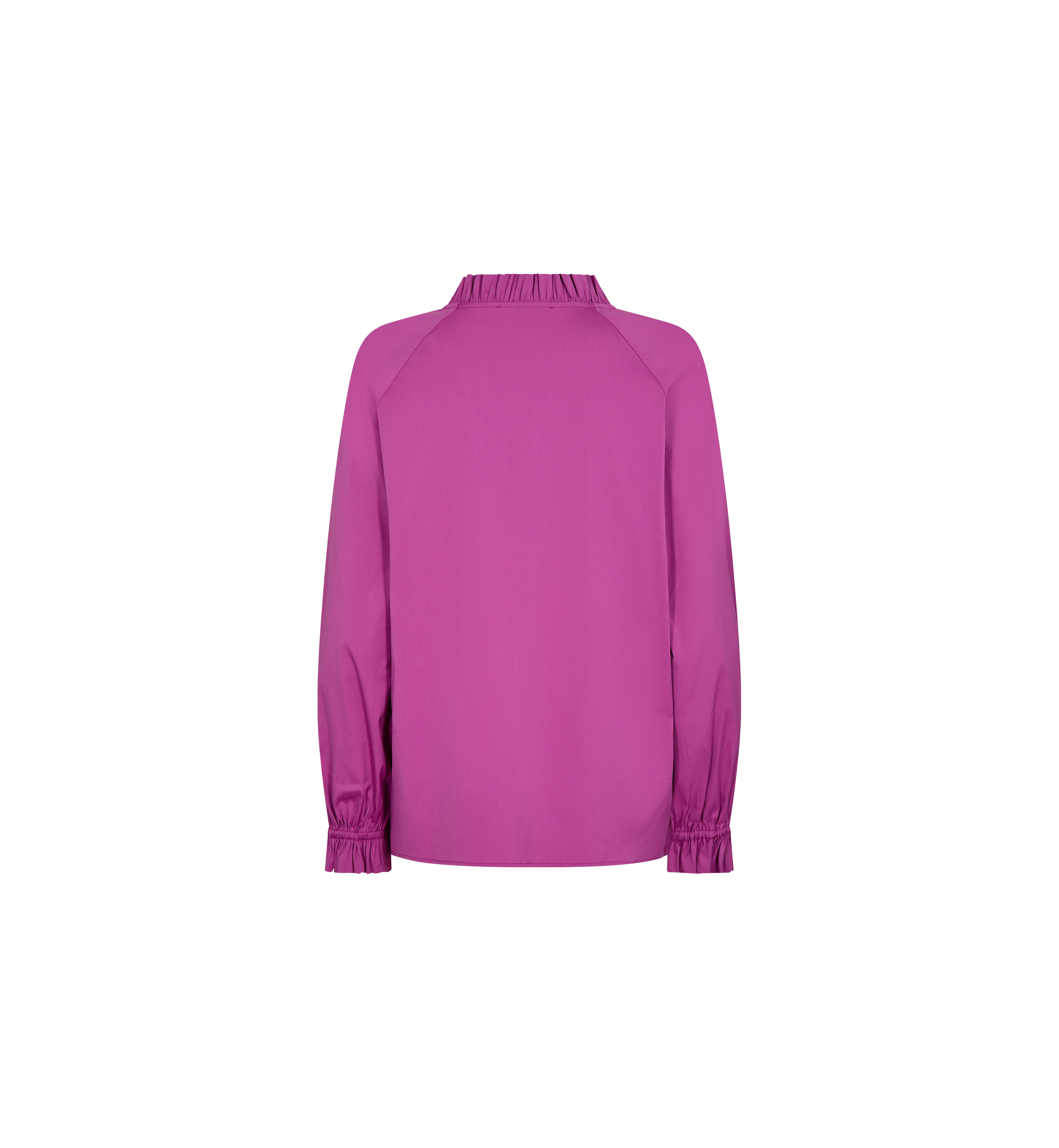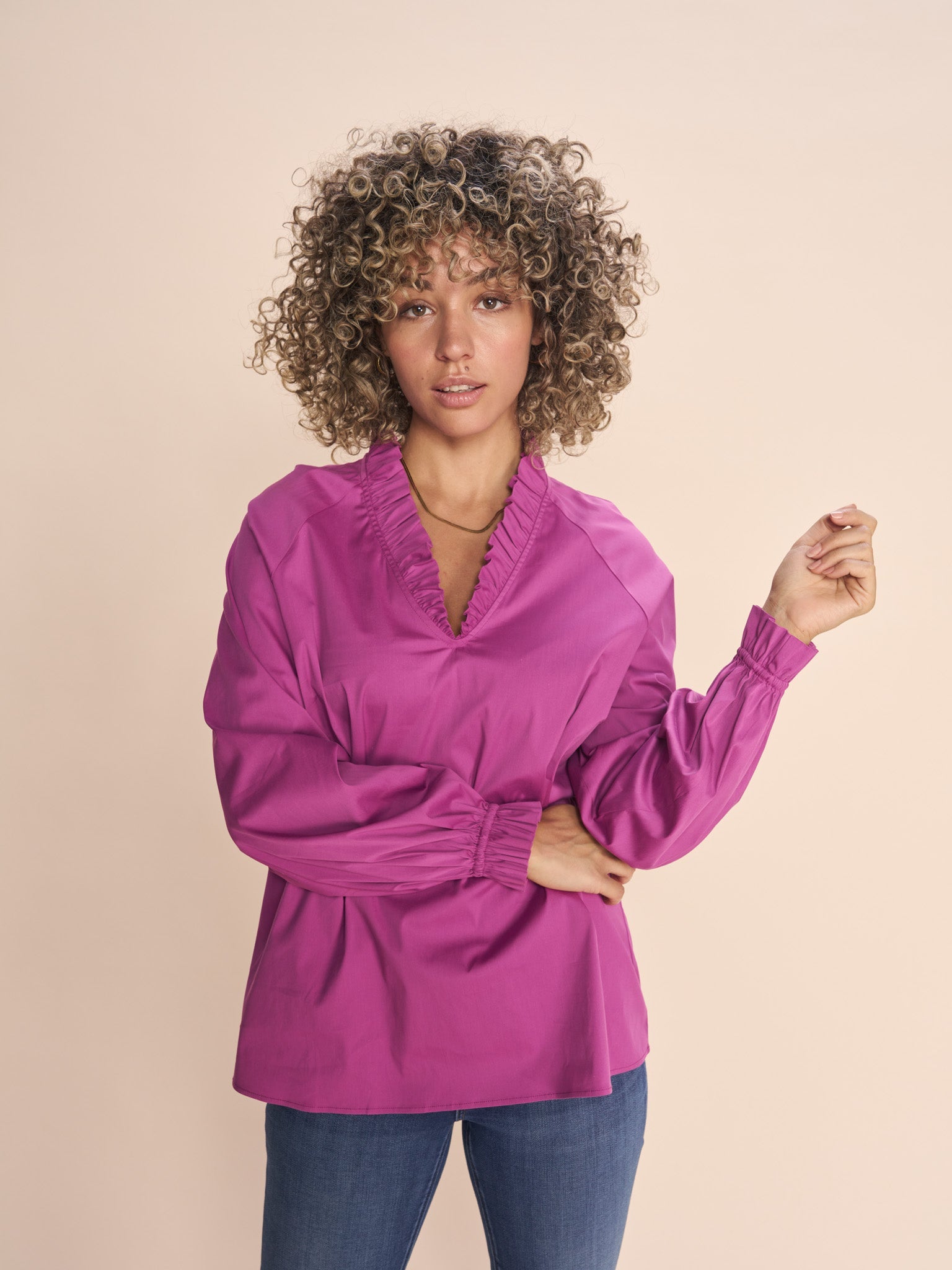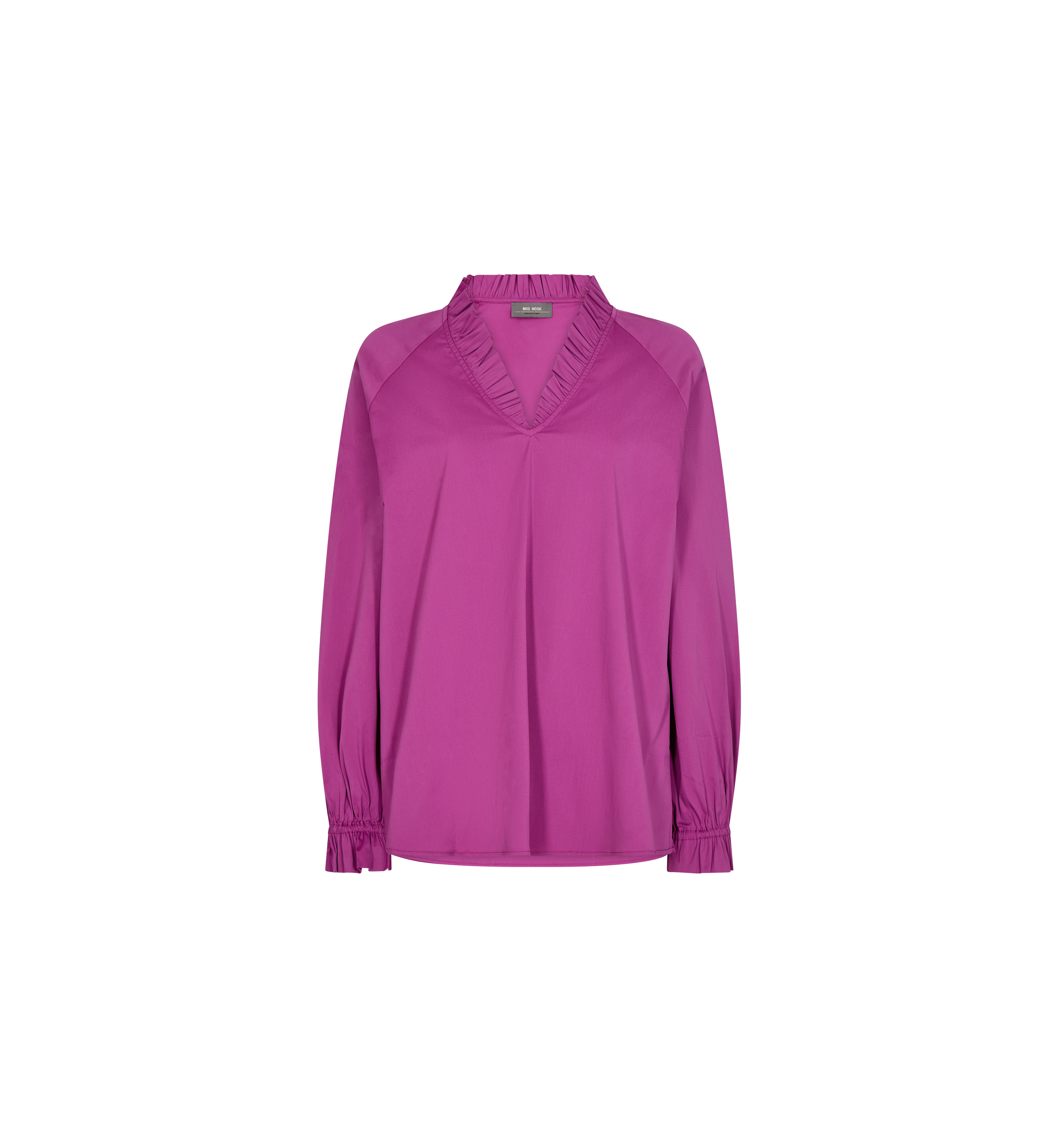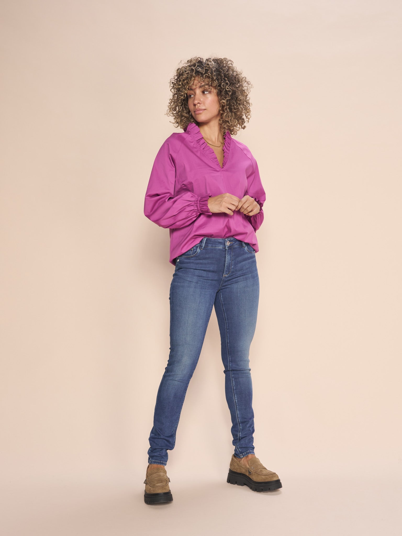 Smuk og elegant bluse designet i en let løs silhuet med flæser omkring halsen, elastiske manchetter og en flatterende V-hals. Style den gerne med et par jeans eller tailoring. Og gerne et par af vores klassiske loafers eller chunky støvler for et fuldendt look.