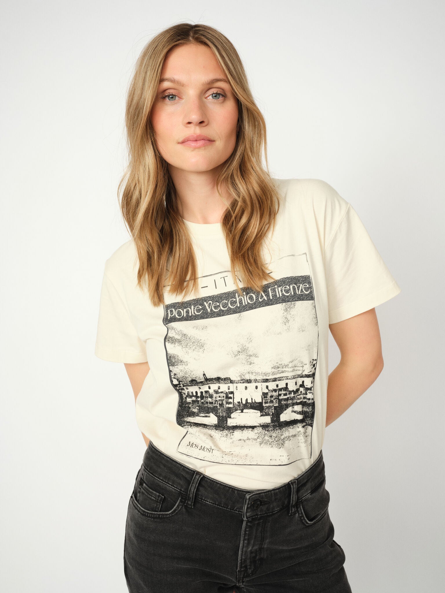 Denne tidløse T-shirt er designet med en klassisk O-hals og korte ærmer, hvilket sikrer en komfortabel og ubesværet pasform. Det markante frontprint tilfører en moderne kant, der gør den til en statement-style i enhver casual garderobe. Style den med jeans for et afslappet hverdagslook, eller brug den under en blazer for en cool og moderne vibe.