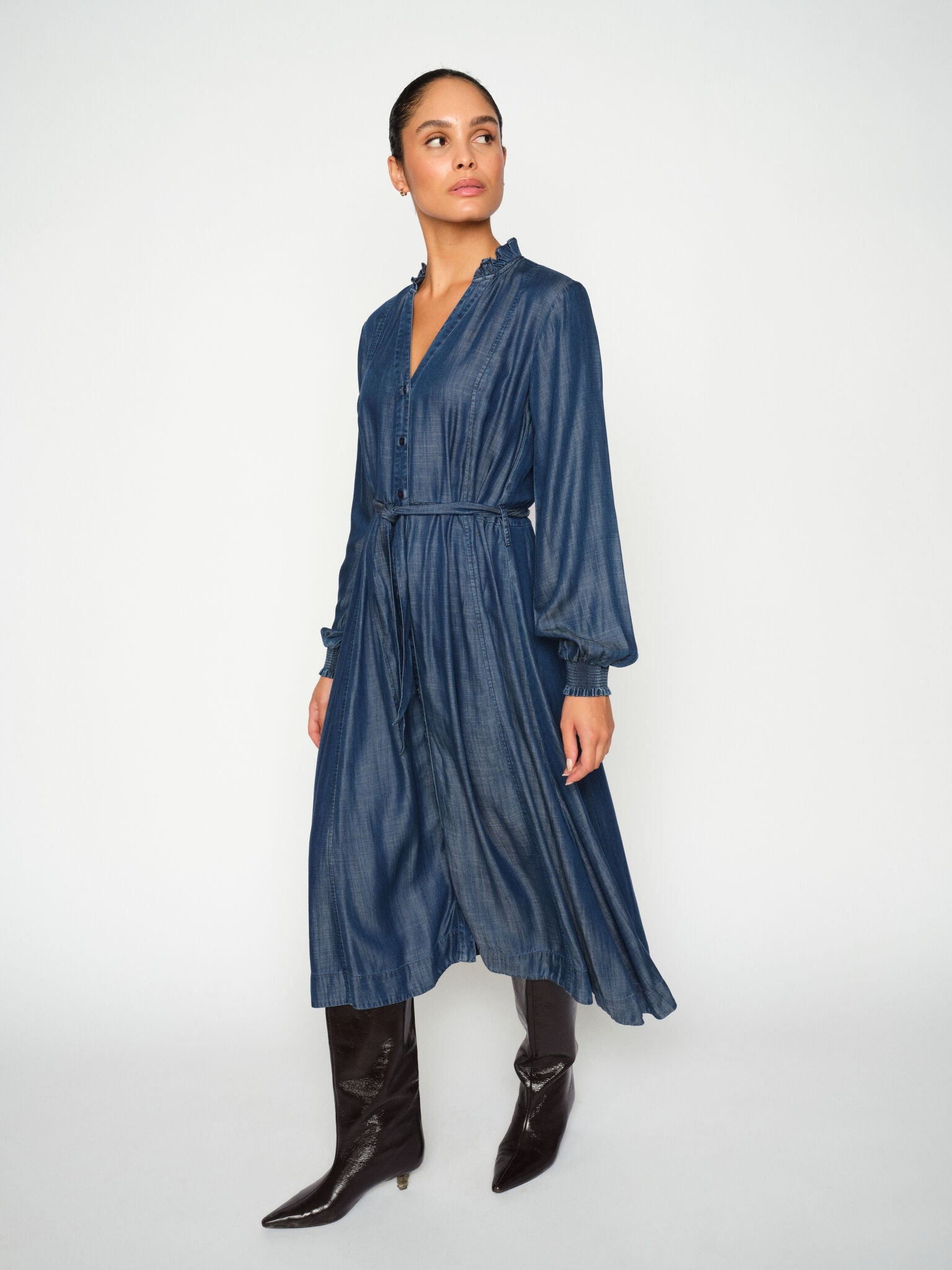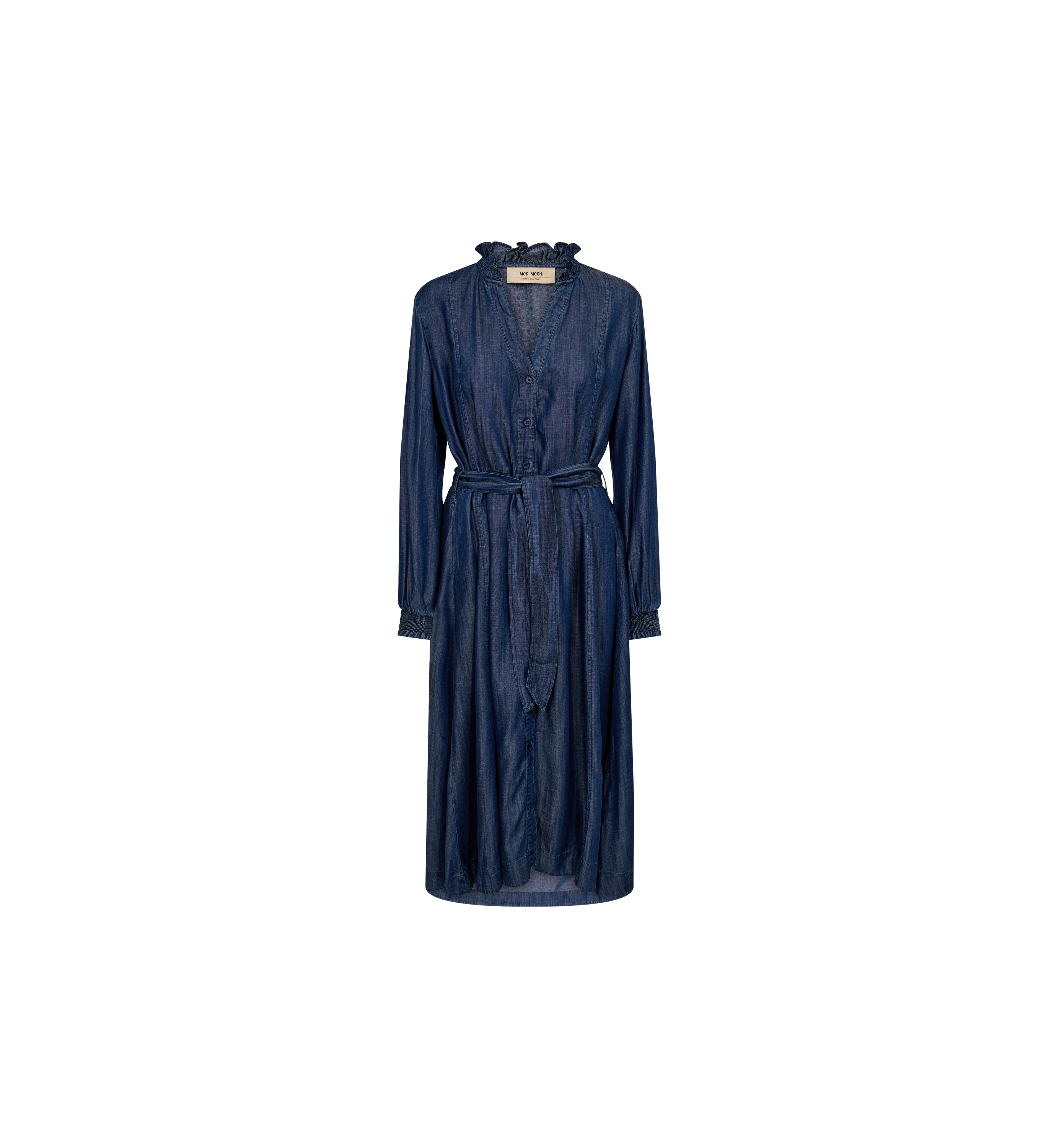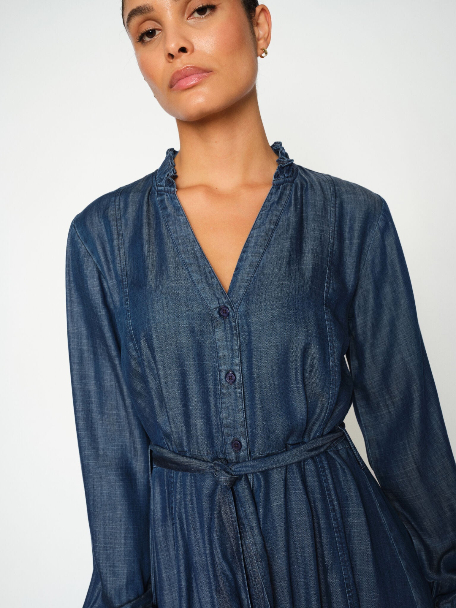 Denne elegante maxi-kjole har en klassisk krave og knaplukning, der skaber en tidløs og raffineret silhuet. Designet i et denim-inspireret look, giver den et let og luftigt alternativ til traditionel denim. Den tætsiddende pasform og lange ærmer tilfører et sofistikeret udtryk, hvilket gør den til et alsidigt valg til både casual og mere formelle anledninger.