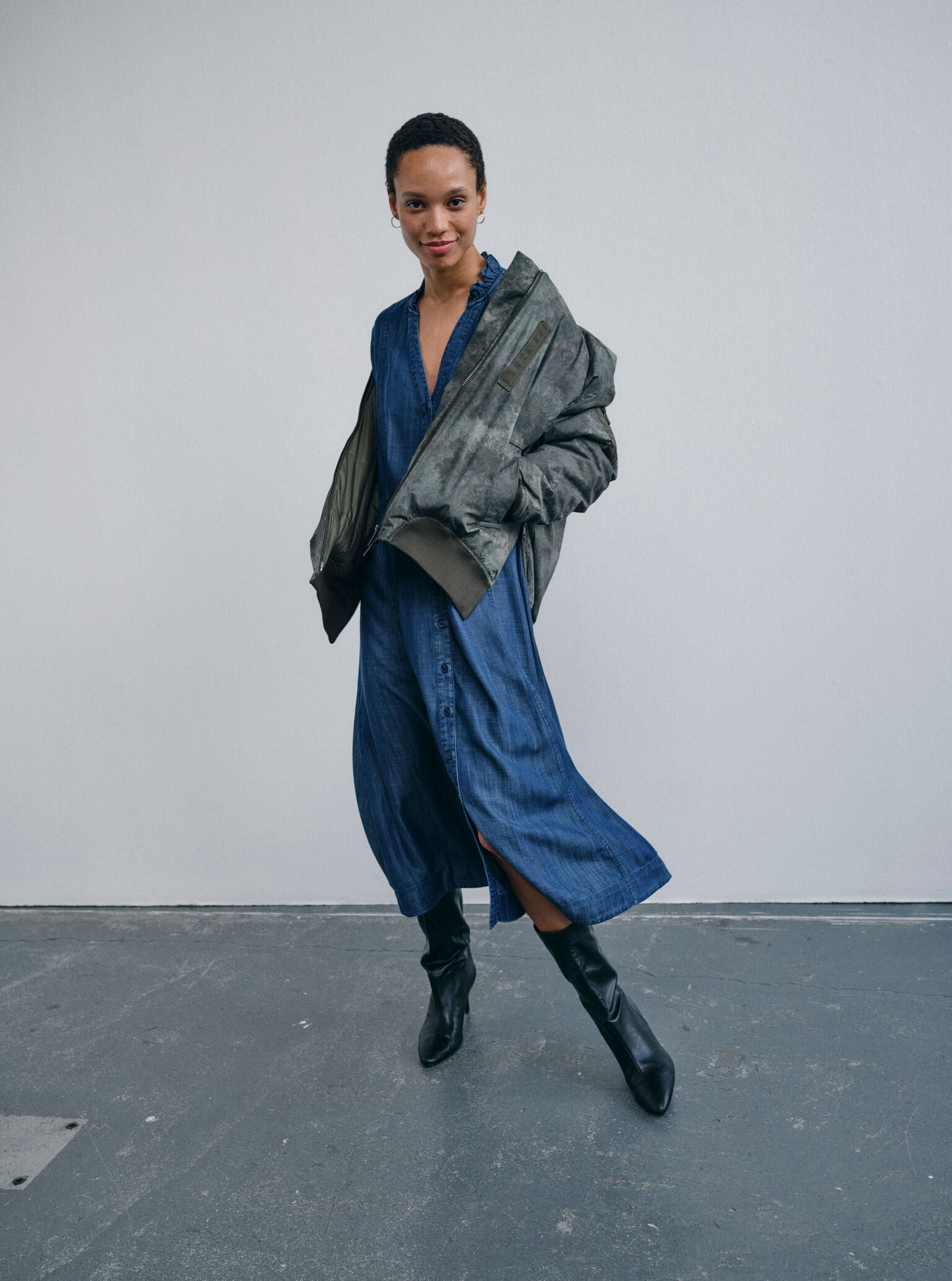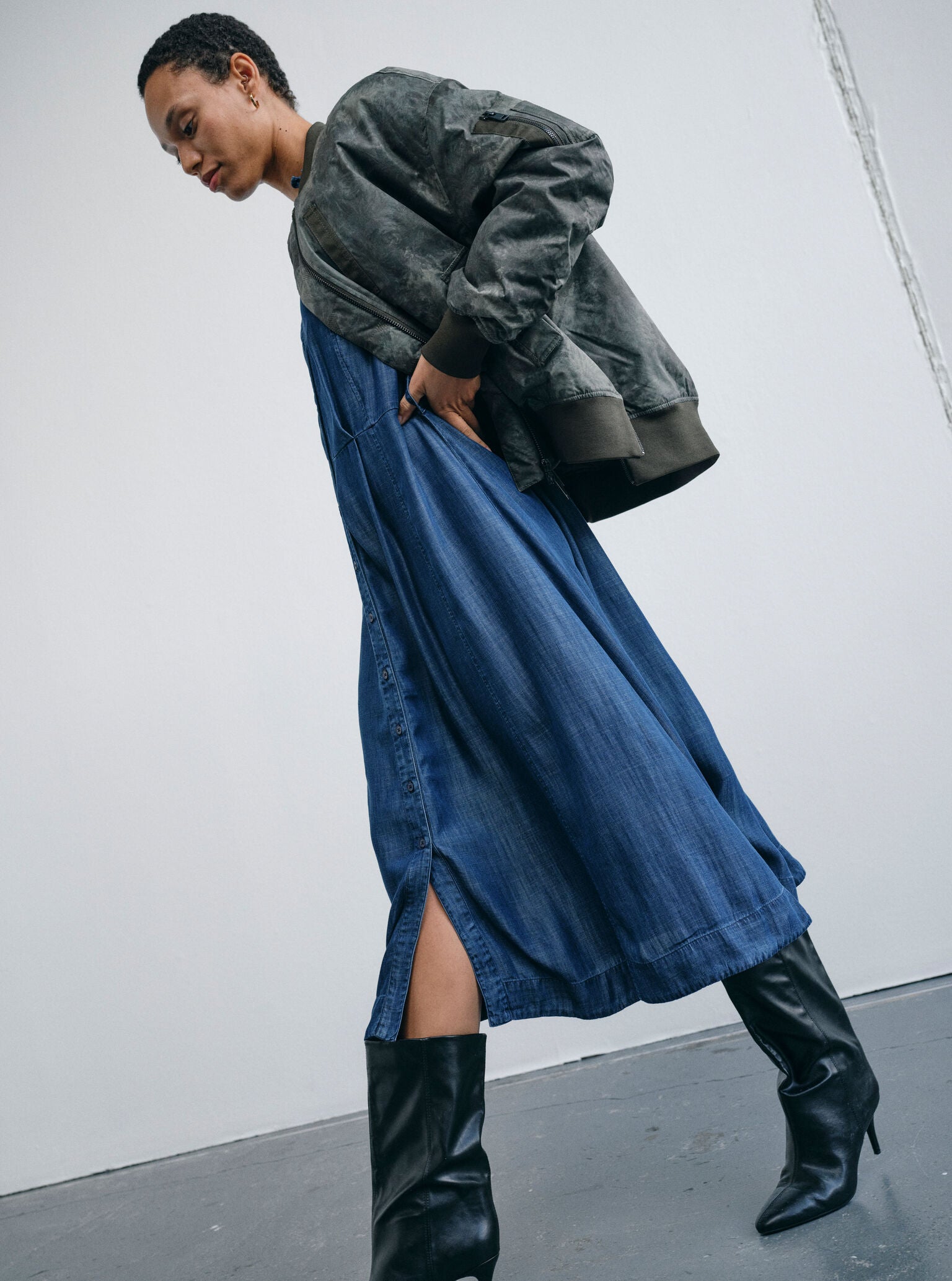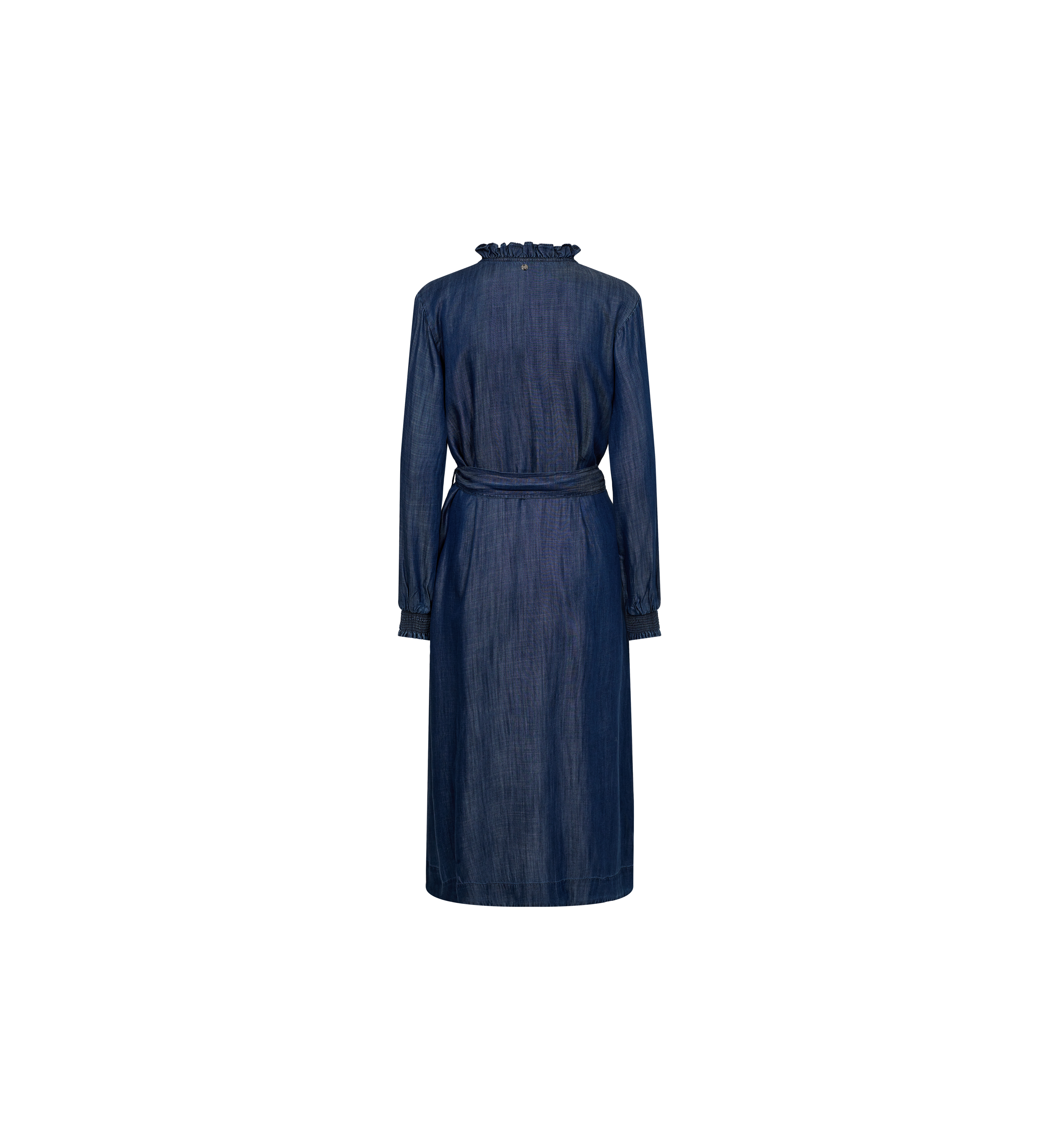 Denne elegante maxi-kjole har en klassisk krave og knaplukning, der skaber en tidløs og raffineret silhuet. Designet i et denim-inspireret look, giver den et let og luftigt alternativ til traditionel denim. Den tætsiddende pasform og lange ærmer tilfører et sofistikeret udtryk, hvilket gør den til et alsidigt valg til både casual og mere formelle anledninger.