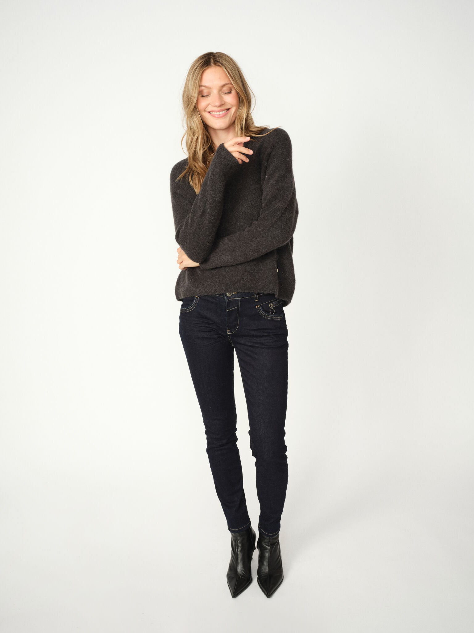 Disse stilfulde jeans har en dyb mørk vask, der giver et tidløst og alsidigt look. Designet i et regulært fit med en flatterende mid-rise, har de kontrastsømme og en elegant lynlåslomme, der tilfører et moderne twist. Med en smule stretch for optimal komfort hele dagen, er de den perfekte kombination af stil og funktionalitet.