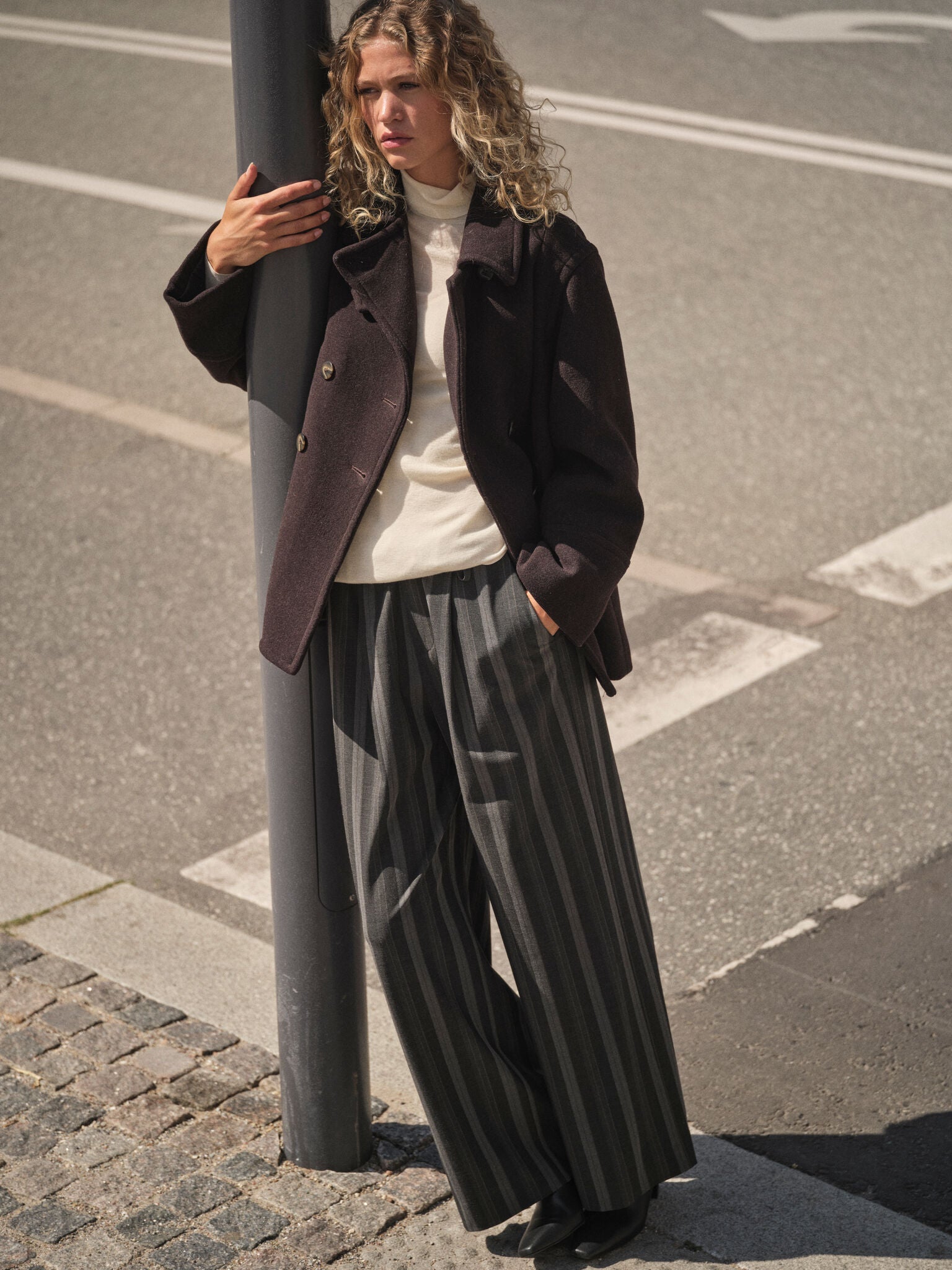 Denne stilfulde uldjakke er designet i et sofistikeret mélange-mønster, der skaber et tidløst og raffineret look. Med en klassisk knaplukning og praktiske lommer kombinerer den elegance med funktionalitet. Bær den over en blød strik eller style den med skræddersyede bukser for et poleret, men afslappet outfit.