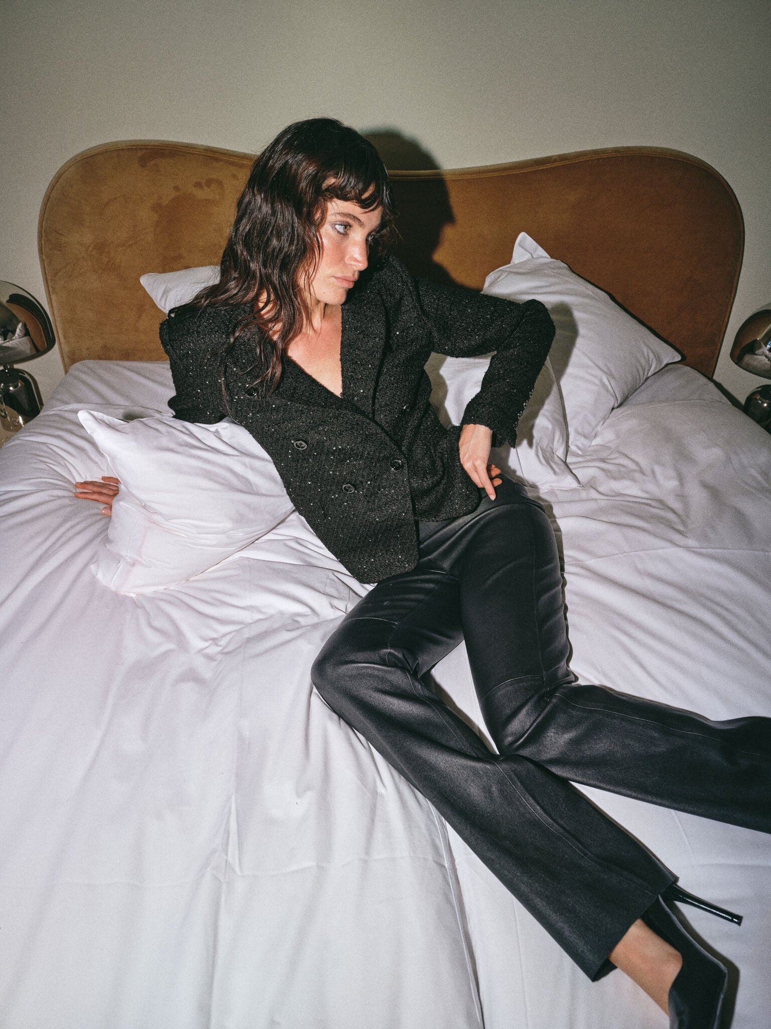 Disse læderleggings er designet til at skabe en slank silhuet med høj talje og et minimalistisk udtryk. Den lange, tætsiddende pasform smyger sig elegant om kroppen og giver et flatterende udgangspunkt til både sofistikerede og afslappede looks. Brug dem med en oversized strik for et ubesværet, kontrastfyldt outfit – eller gå all-in med stiletter og blazer for et stilrent aftenlook.