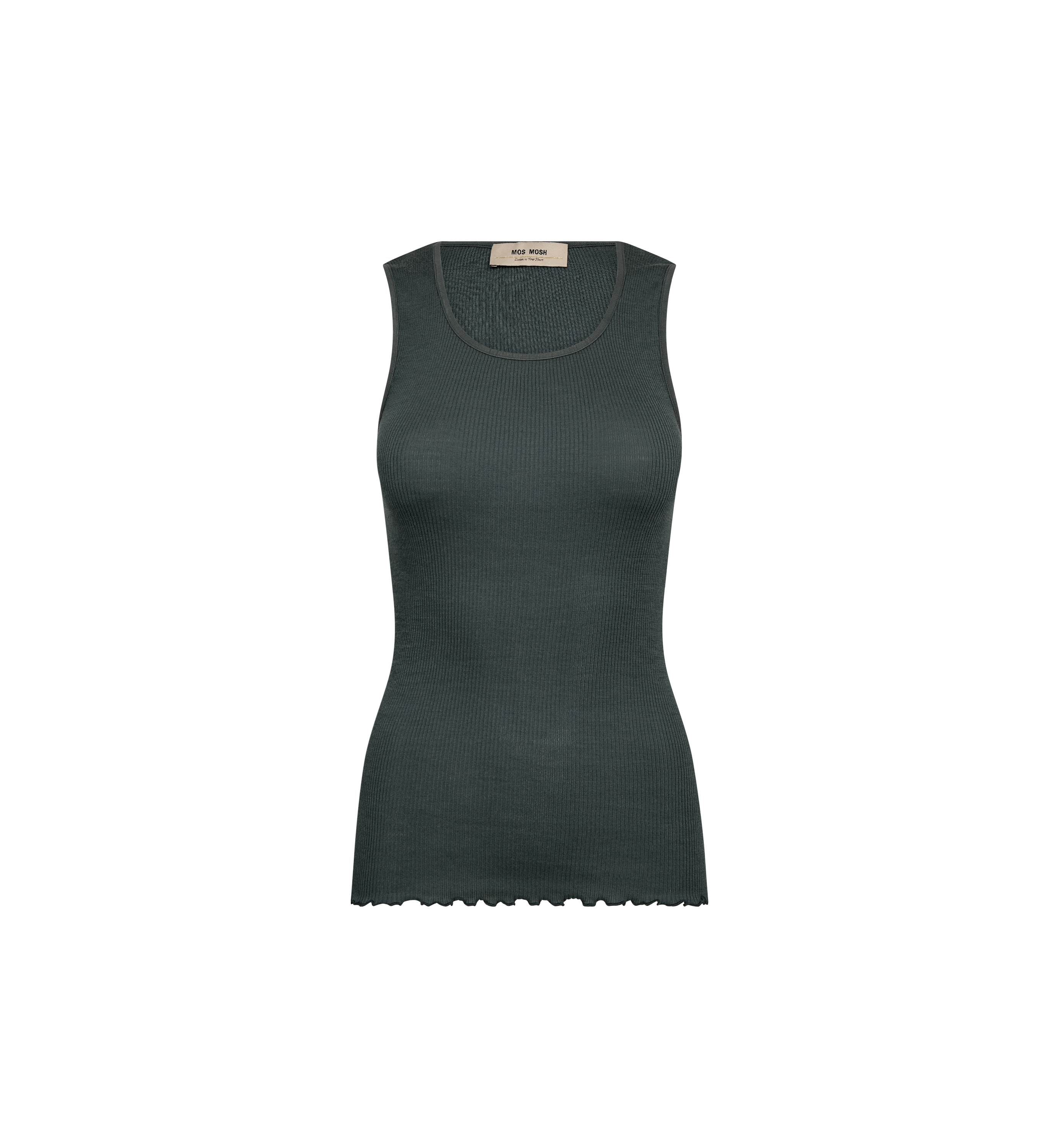 Denne sømløse tanktop er fremstillet i en blød uld- og modalblanding og har en tætsiddende silhuet med en elegant ribbet finish og en feminin bølget kant. Perfekt som en alsidig basisstyle – brug den under en skræddersyet blazer eller lad den tilføre et delikat touch under en chunky strik.