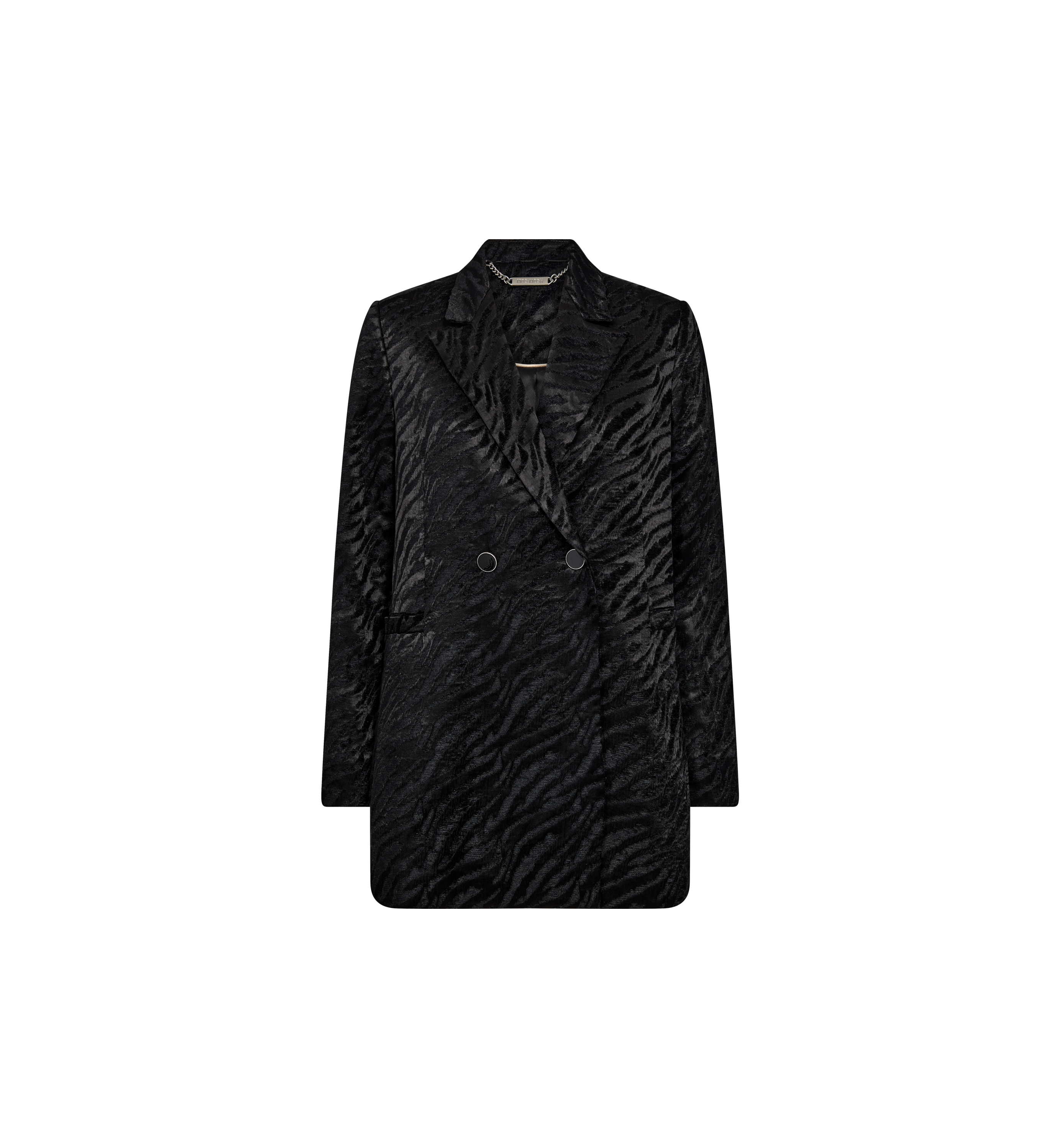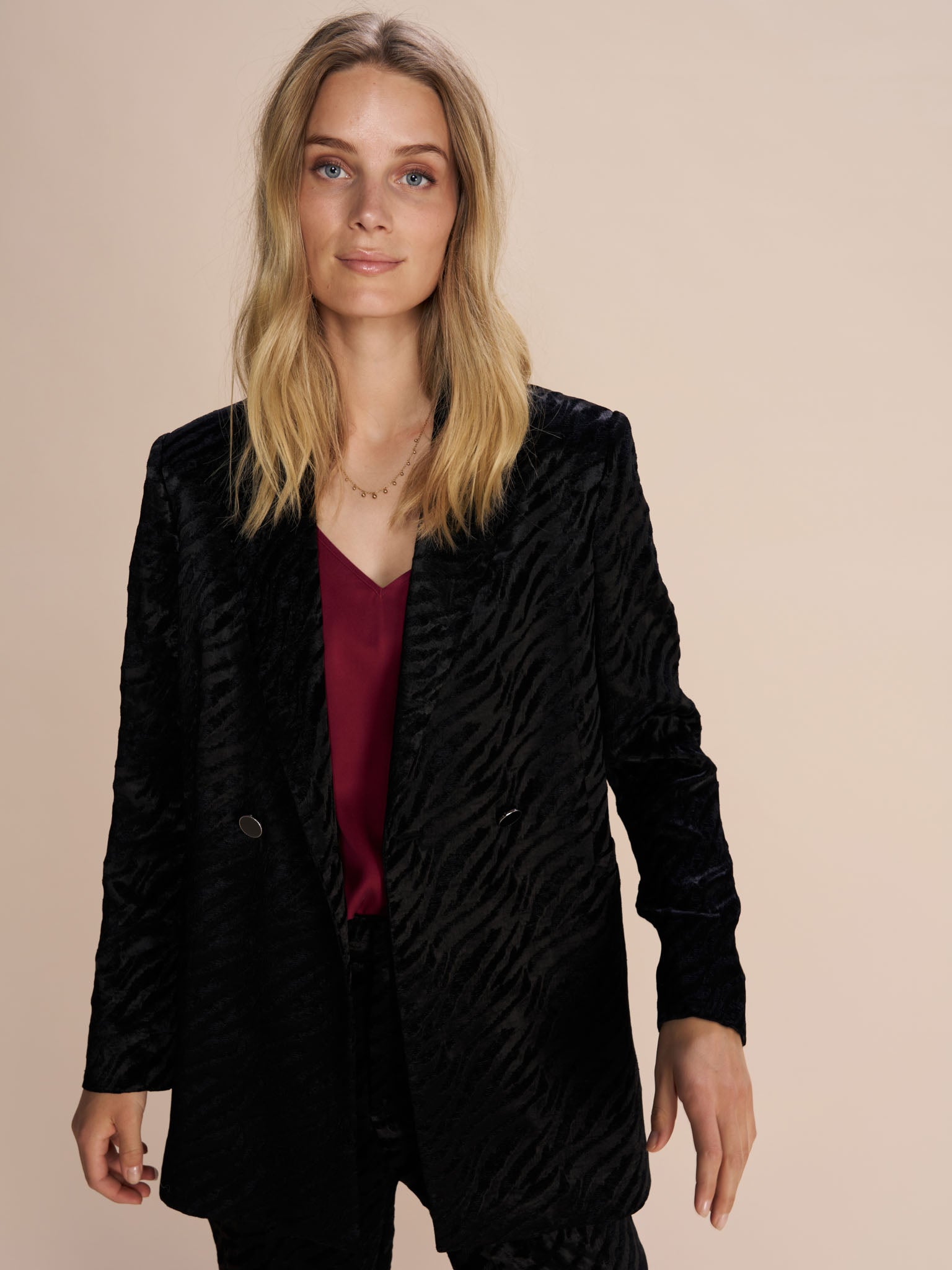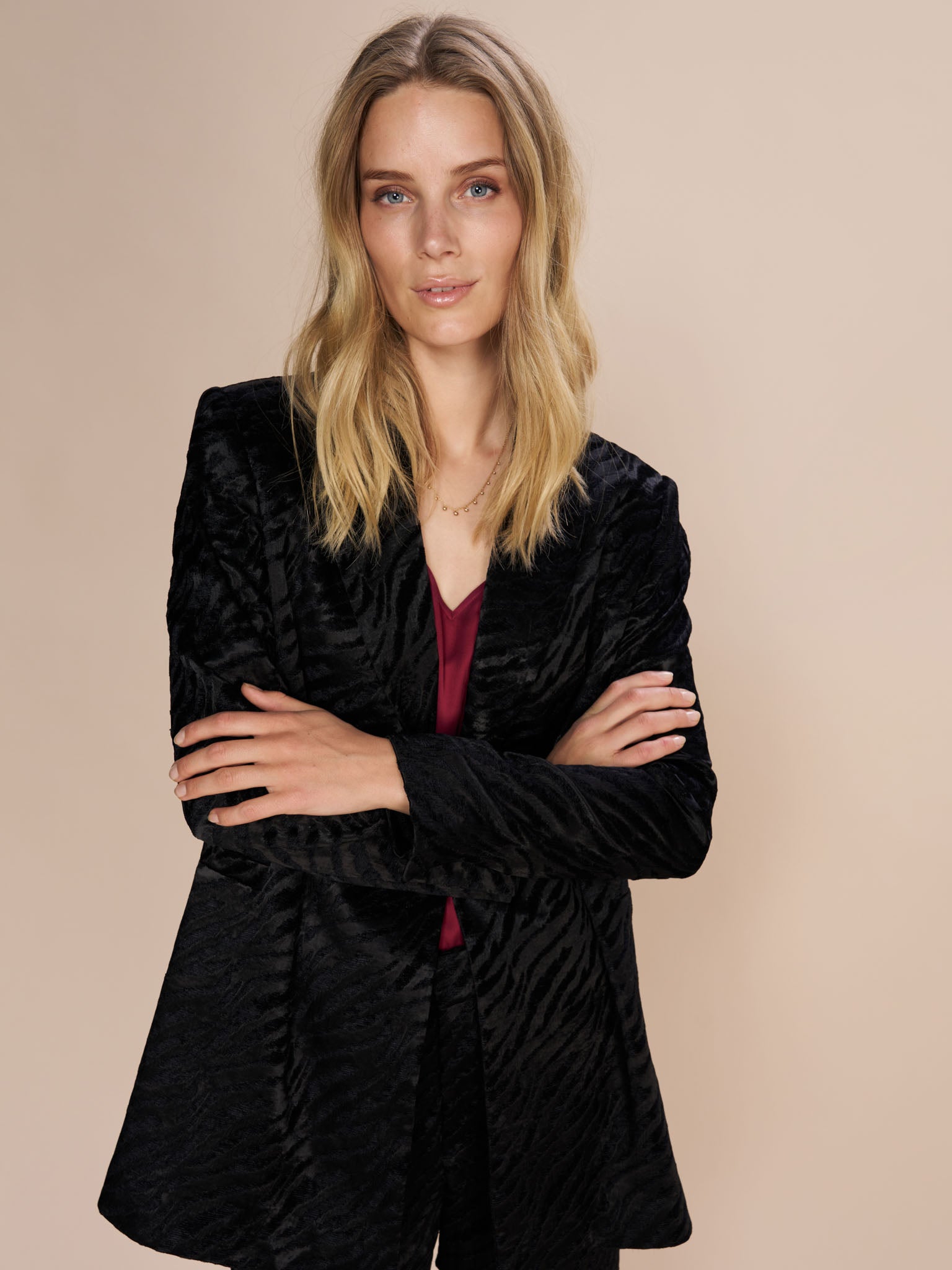 Smuk tailored blazer designet i en lang silhuet med klaplommer og knapper. Med et flot tone-in-tone zebramønster som finish. Passer perfekt til jeans eller tailored bukser og stiletter.