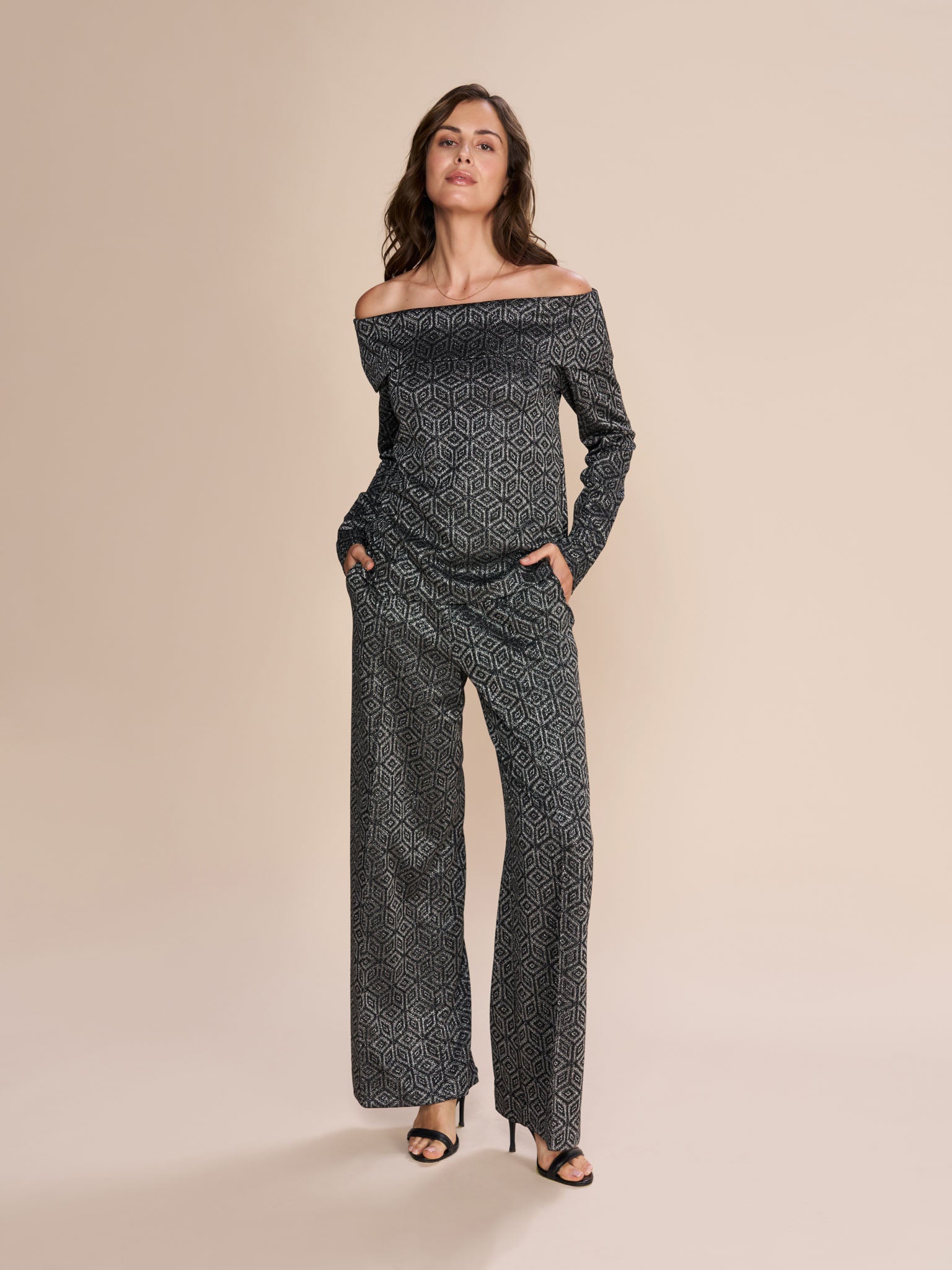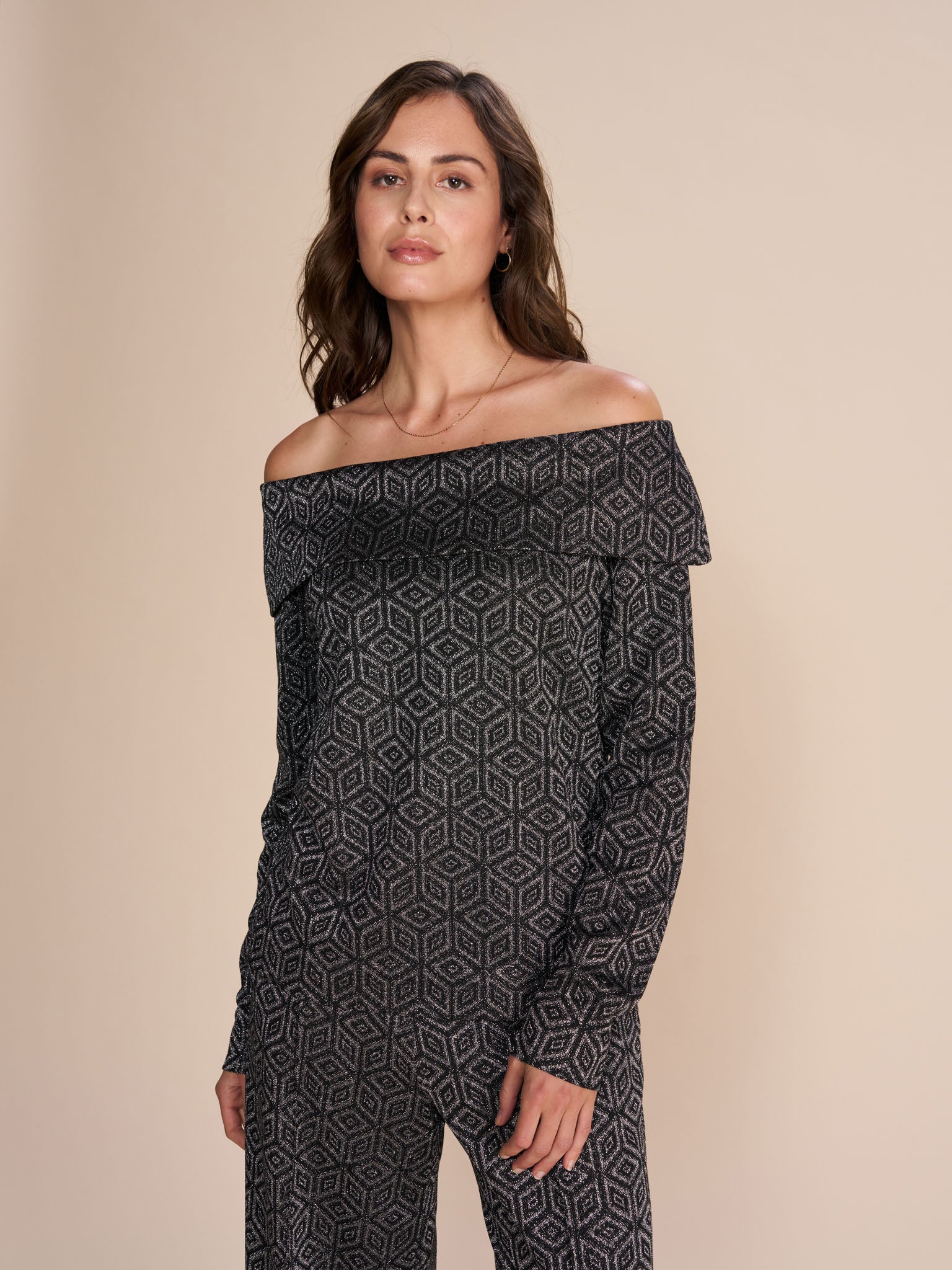 Giv dit outfit et løft med denne off-shoulder bluse. Designet i en regulær silhuet og med et flot glimmermønster som finish. Sæt den sammen med vores matchende bukser for et koordineret look – og gerne et par stiletter som prikken over i'et!