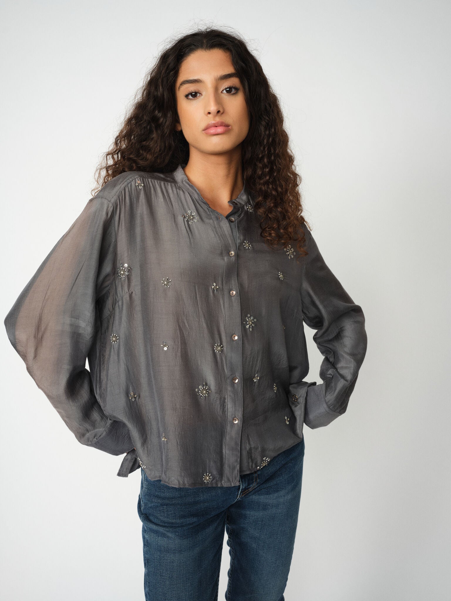 Denne statement skjorte har en glansfuld, næsten glam finish. Den er dekoreret med gunmetal-perler og designet med klassiske detaljer som knapper og manchetter. Et blikfang, der fanger lyset og løfter ethvert look.