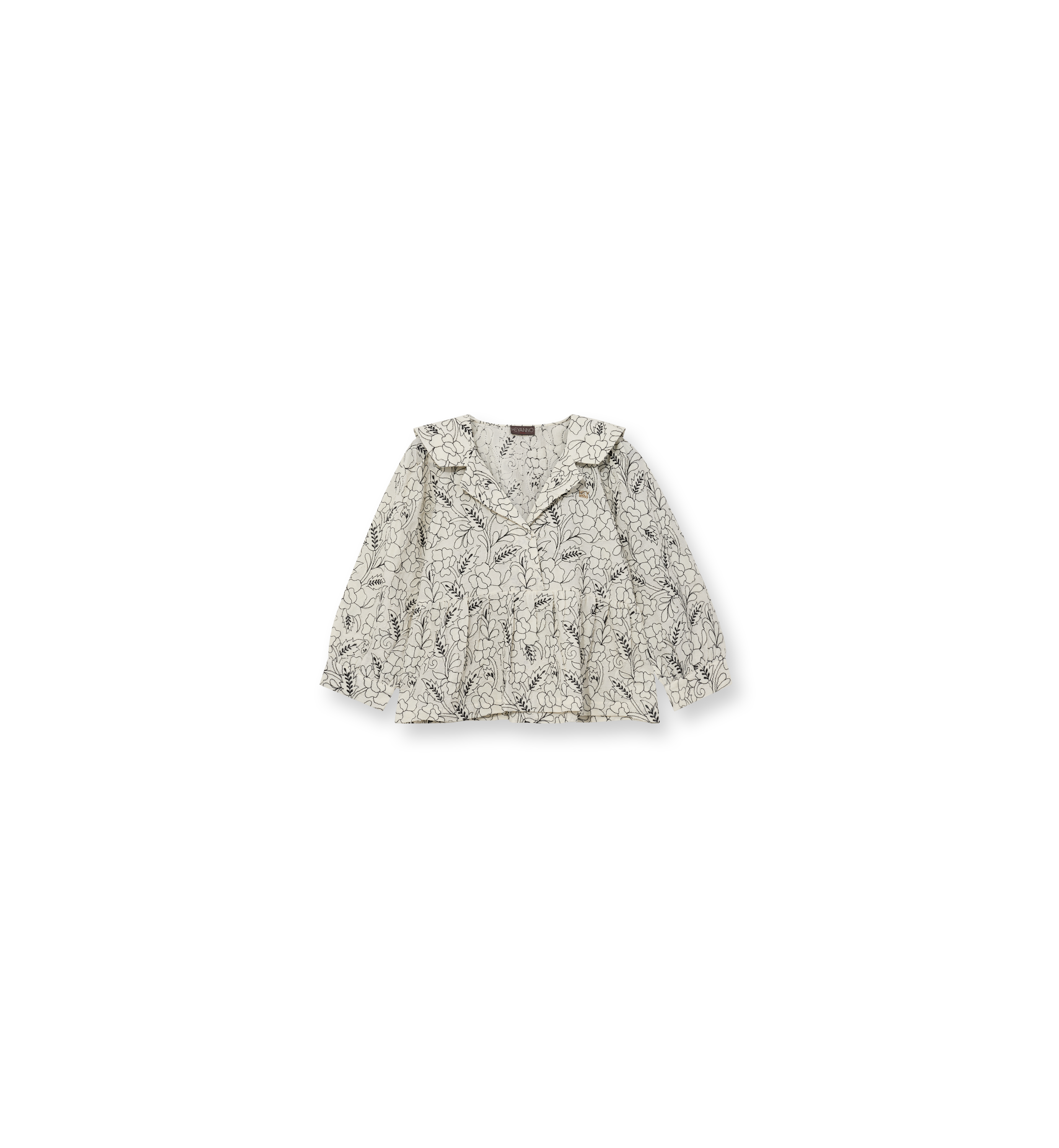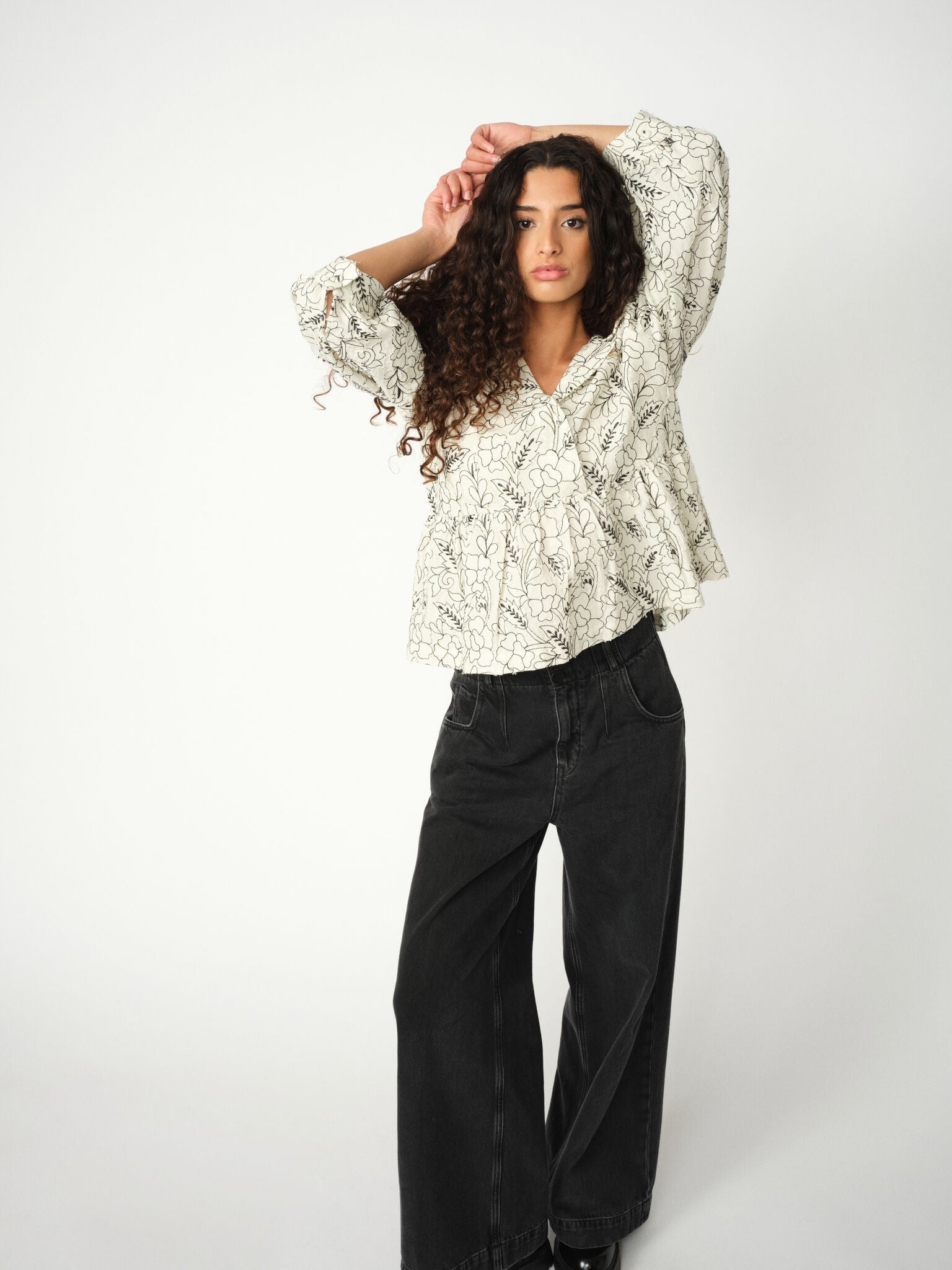 Jacquardbluse med sort broderi og et feminint snit. Blusen har et moderne udtryk med ekstra kant og er let at style med både denim og sorte toner – uanset om det er til hverdag eller aften.