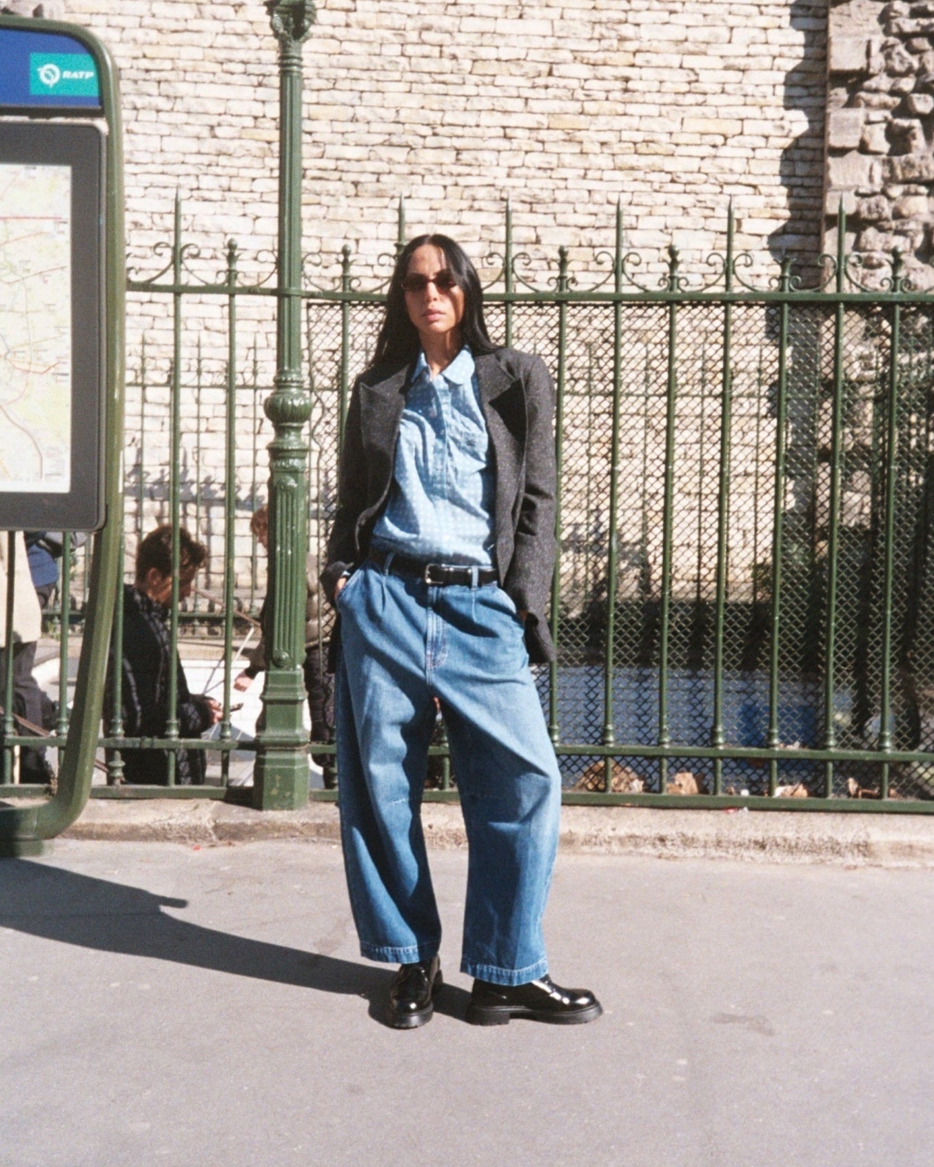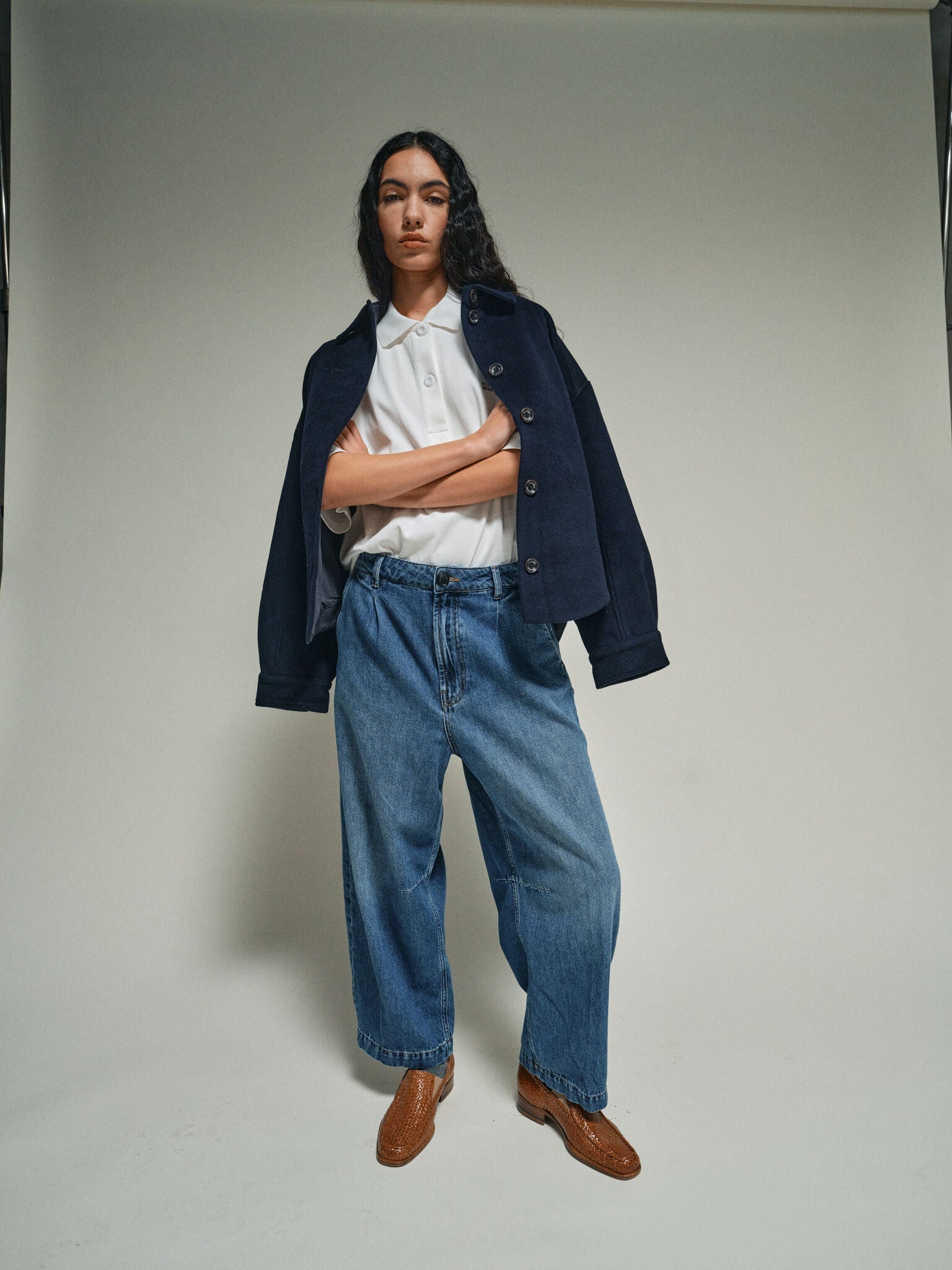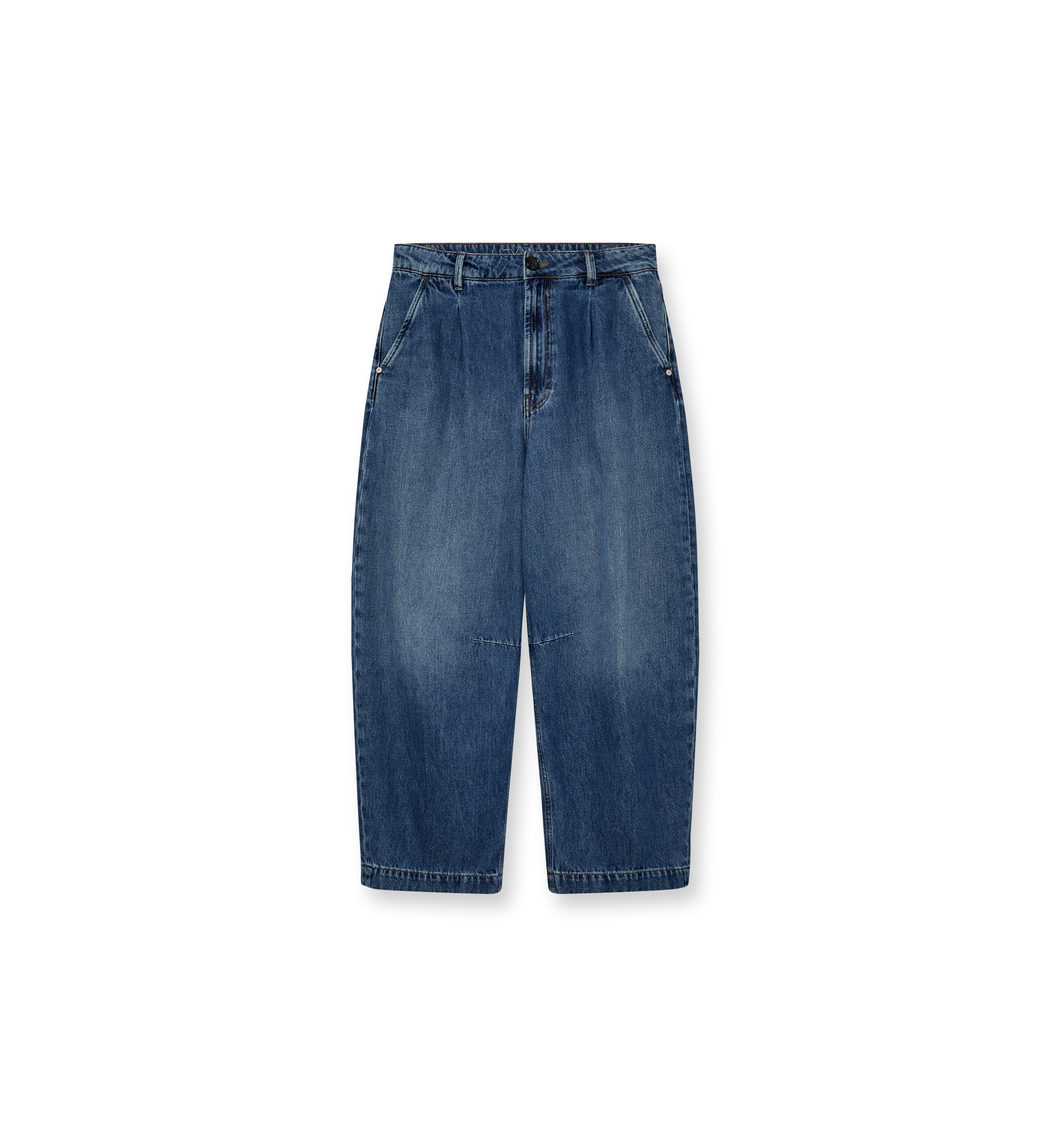 Jeans med wide-leg fit og lav talje, lavet i en blød, drapy denim. Den sorte knap og sorte undertone i vasken giver en rå finish og ekstra dybde.
