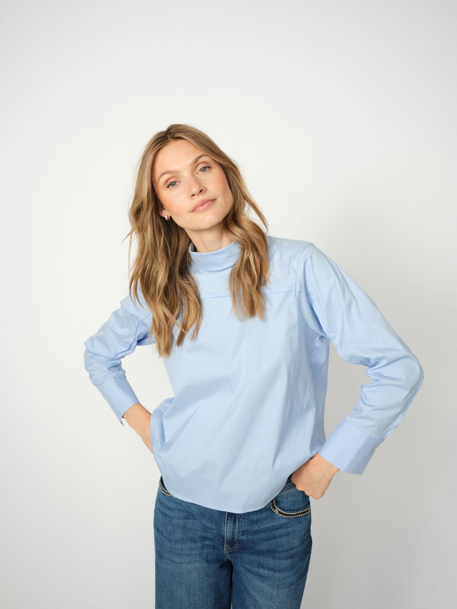 Denne elegante bluse har en høj halsudskæring og en klassisk regulær pasform, der tilfører et tidløst og sofistikeret udtryk. En diskret detalje bagpå giver et feminint touch, mens de knappede manchetter fuldender det raffinerede design. Brug den med skræddersyede bukser for et poleret look eller med jeans for en chic hverdagsstil.