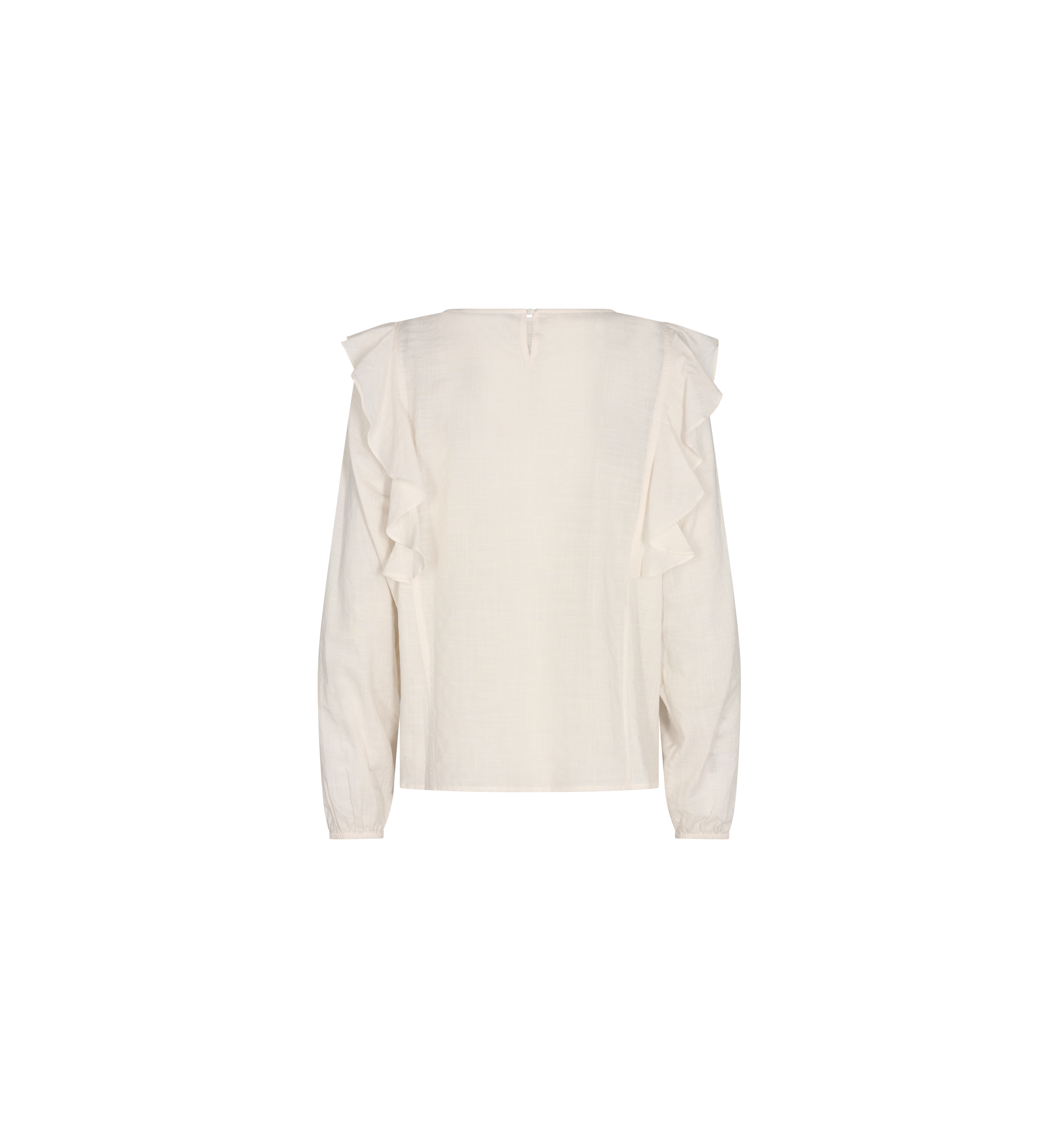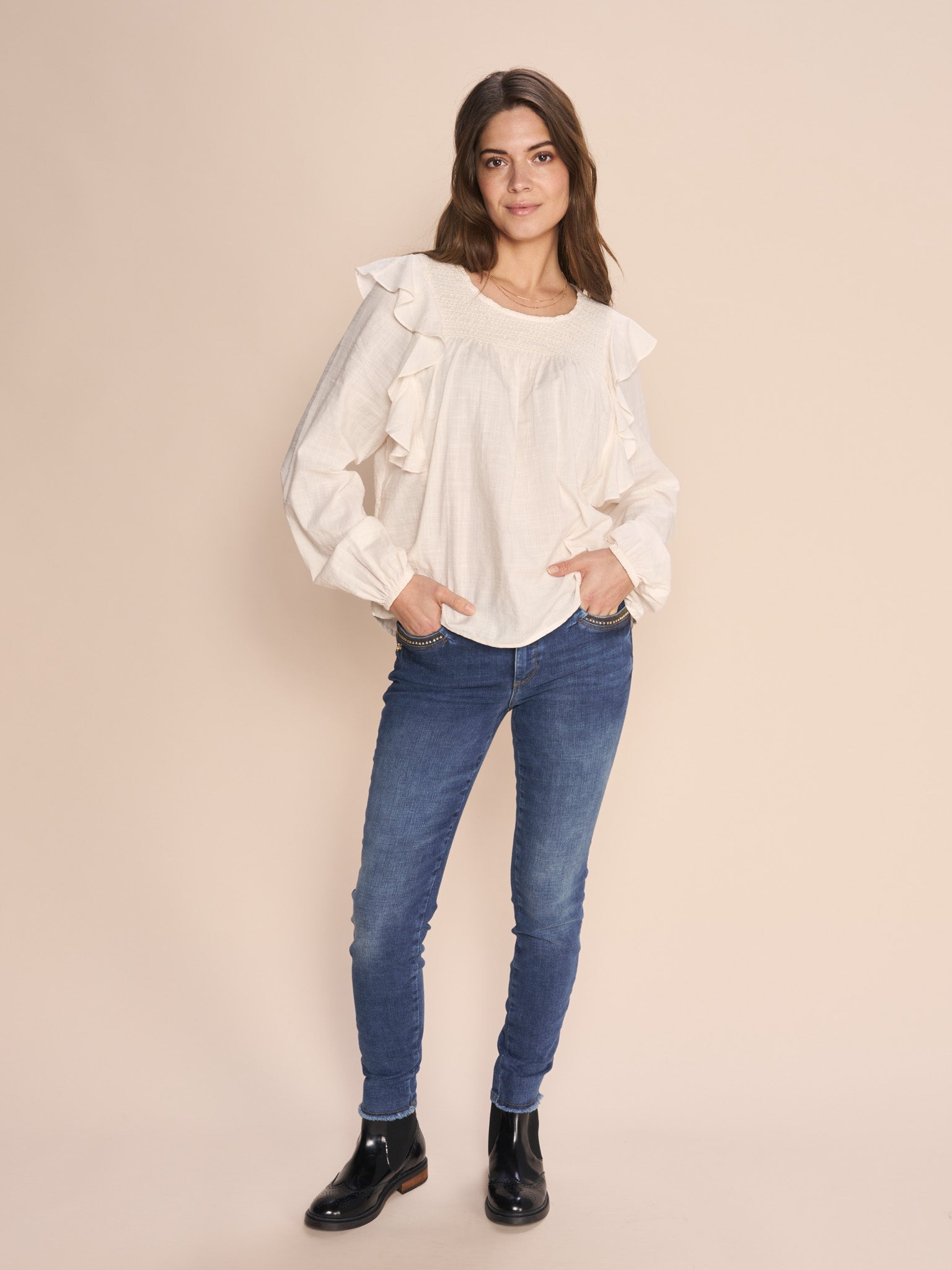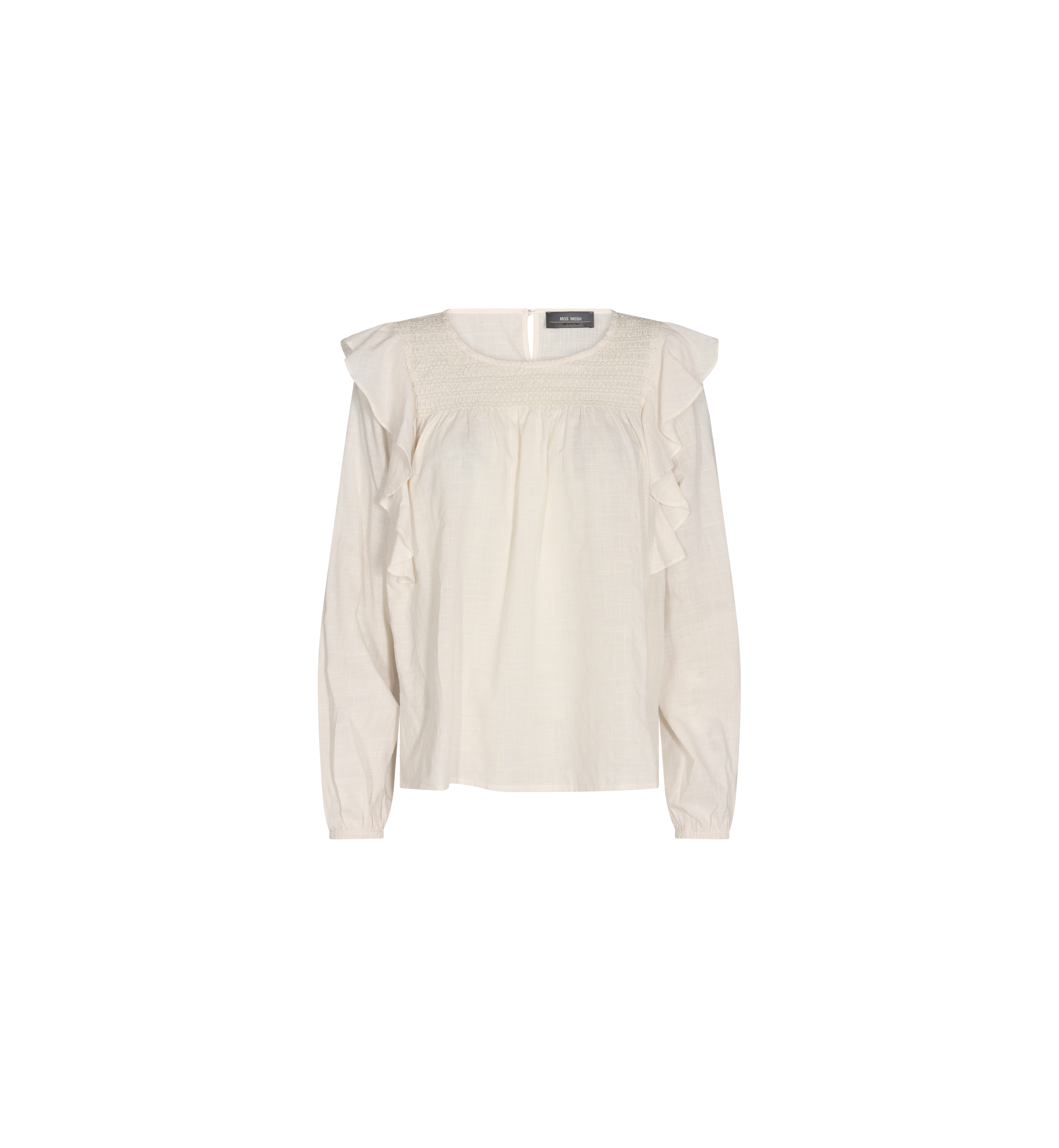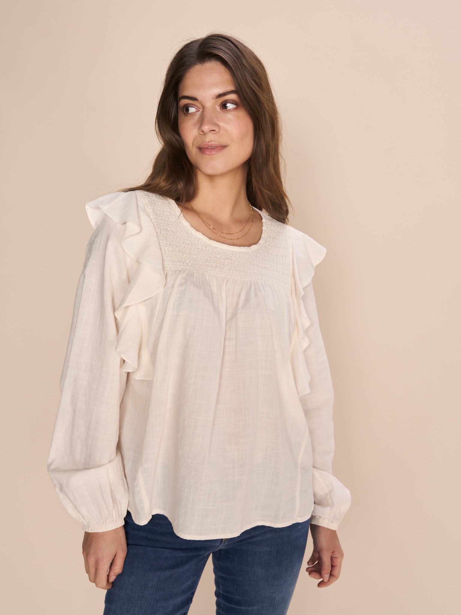 Skøn bluse inspireret af 70'erne og fremstillet i en lækker viskose- og bomuldsblanding. Designet i en regulær silhuet med plisseringer, indsnit, smock-detaljer og flæser som finish. Brug den gerne til tailoring eller et par jeans, alt efter lejlighed og behov.