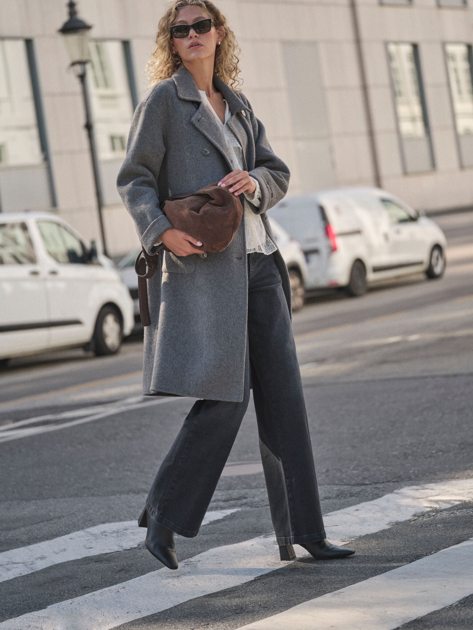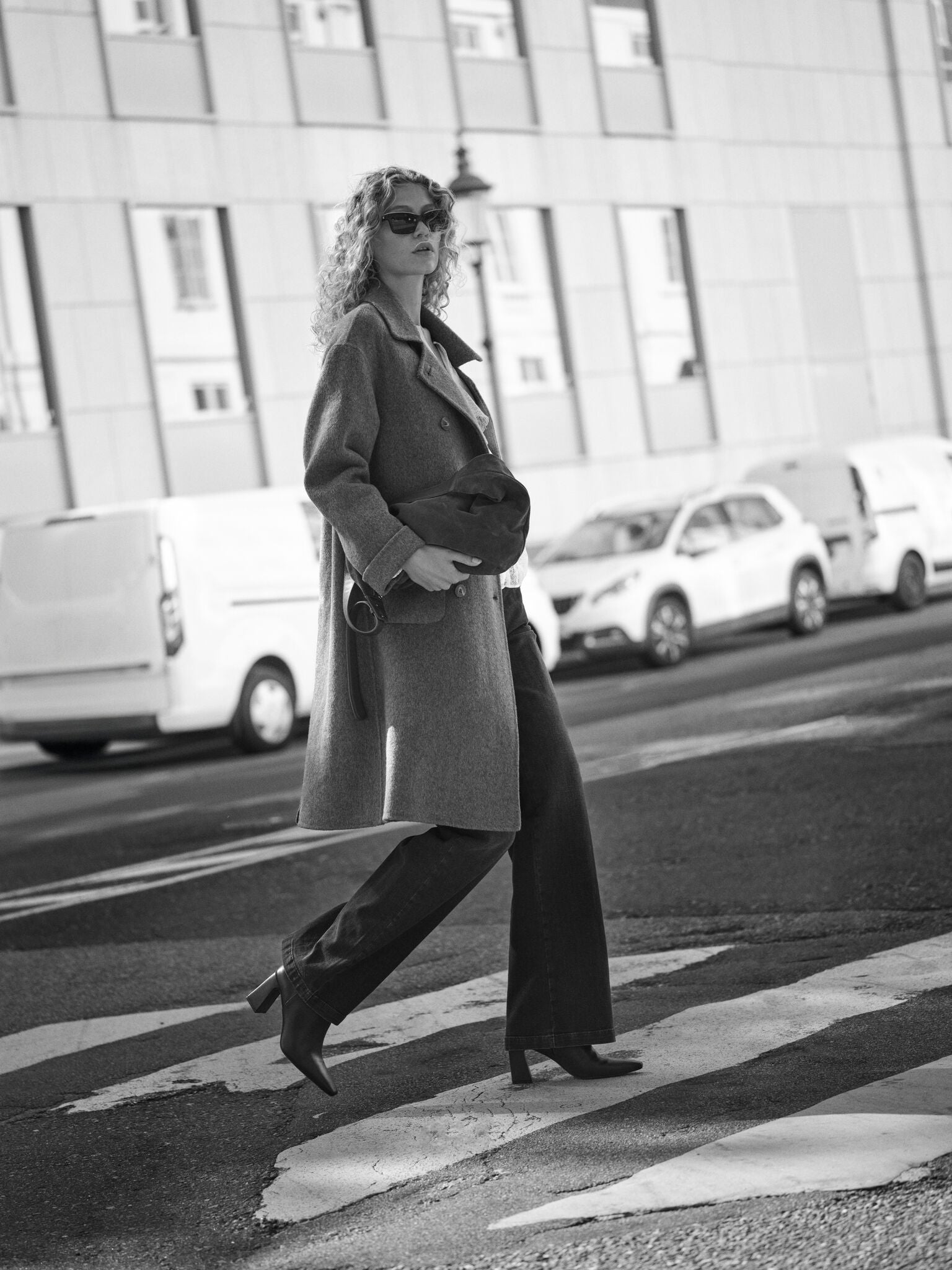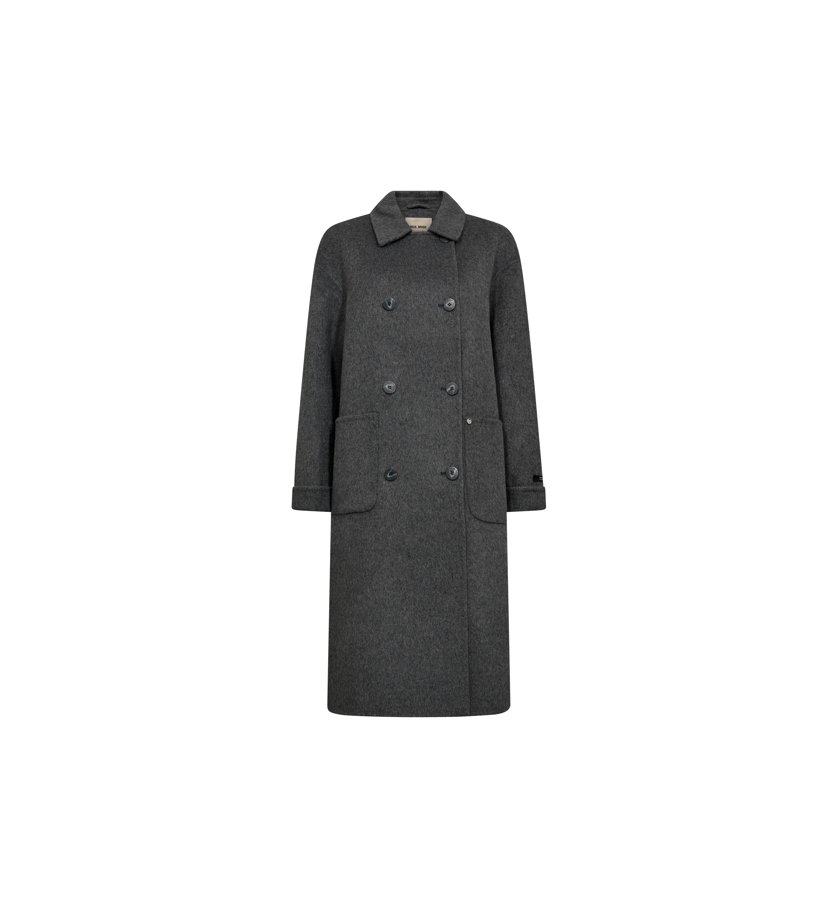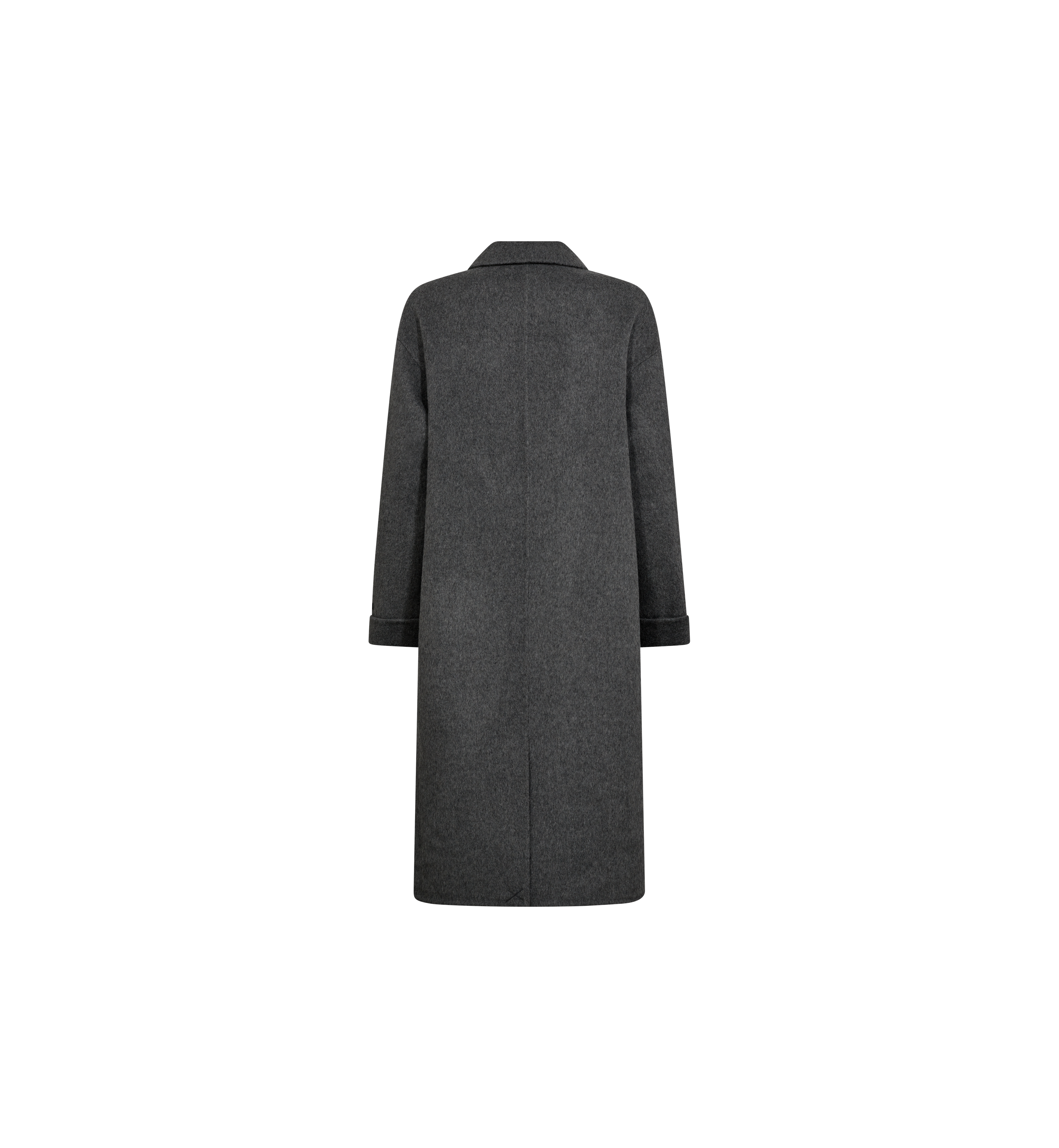 Denne sofistikerede lange uldfrakke har et smukt meleret mønster, der udstråler en raffineret og tidløs elegance. Frakken er designet med et håndlavet look og uforet konstruktion, hvor sømmene er sirligt forarbejdet i hånden, hvilket skaber en eksklusiv fornemmelse. Frakken fuldendes med en klassisk krave og knaplukning.