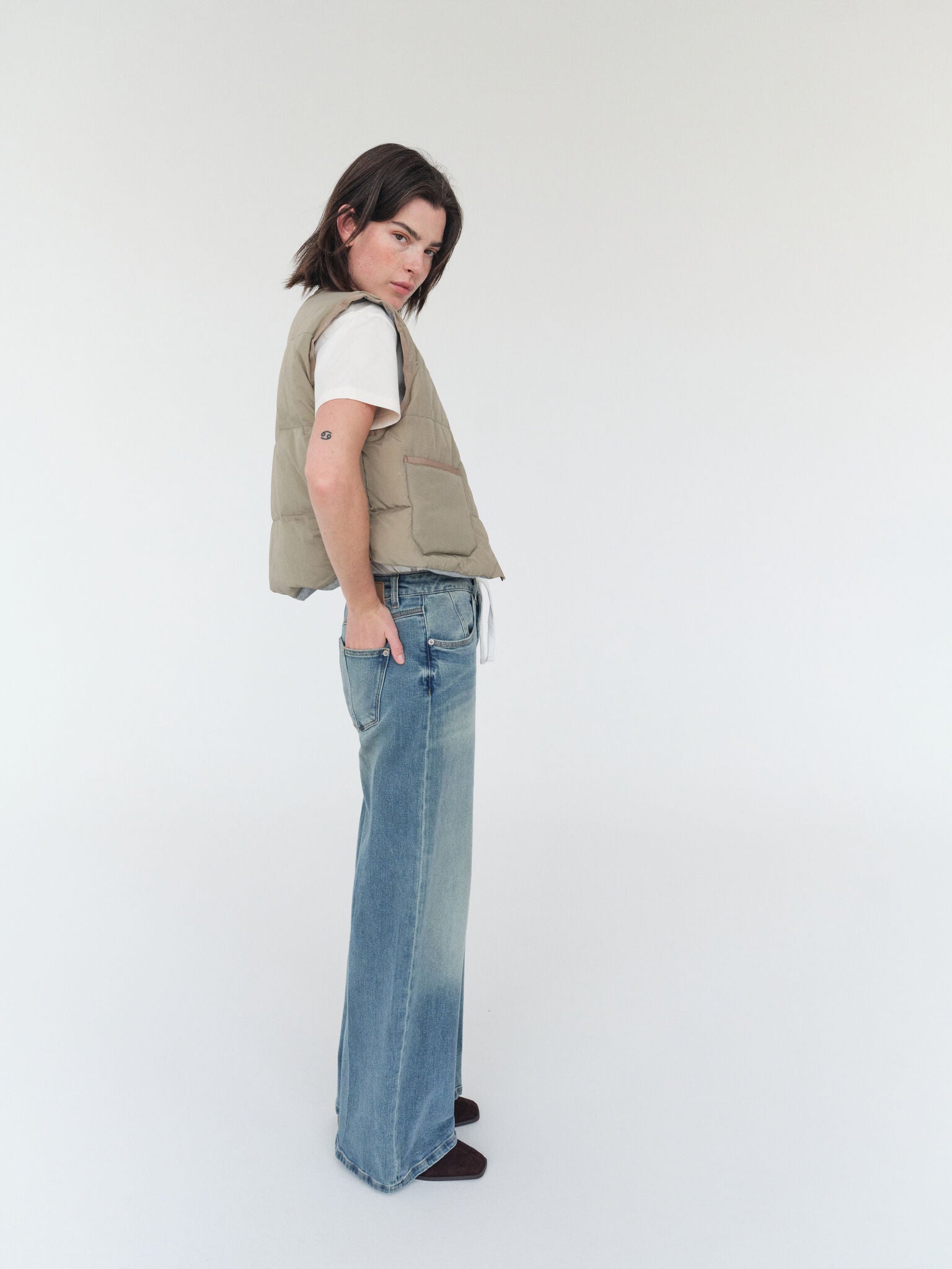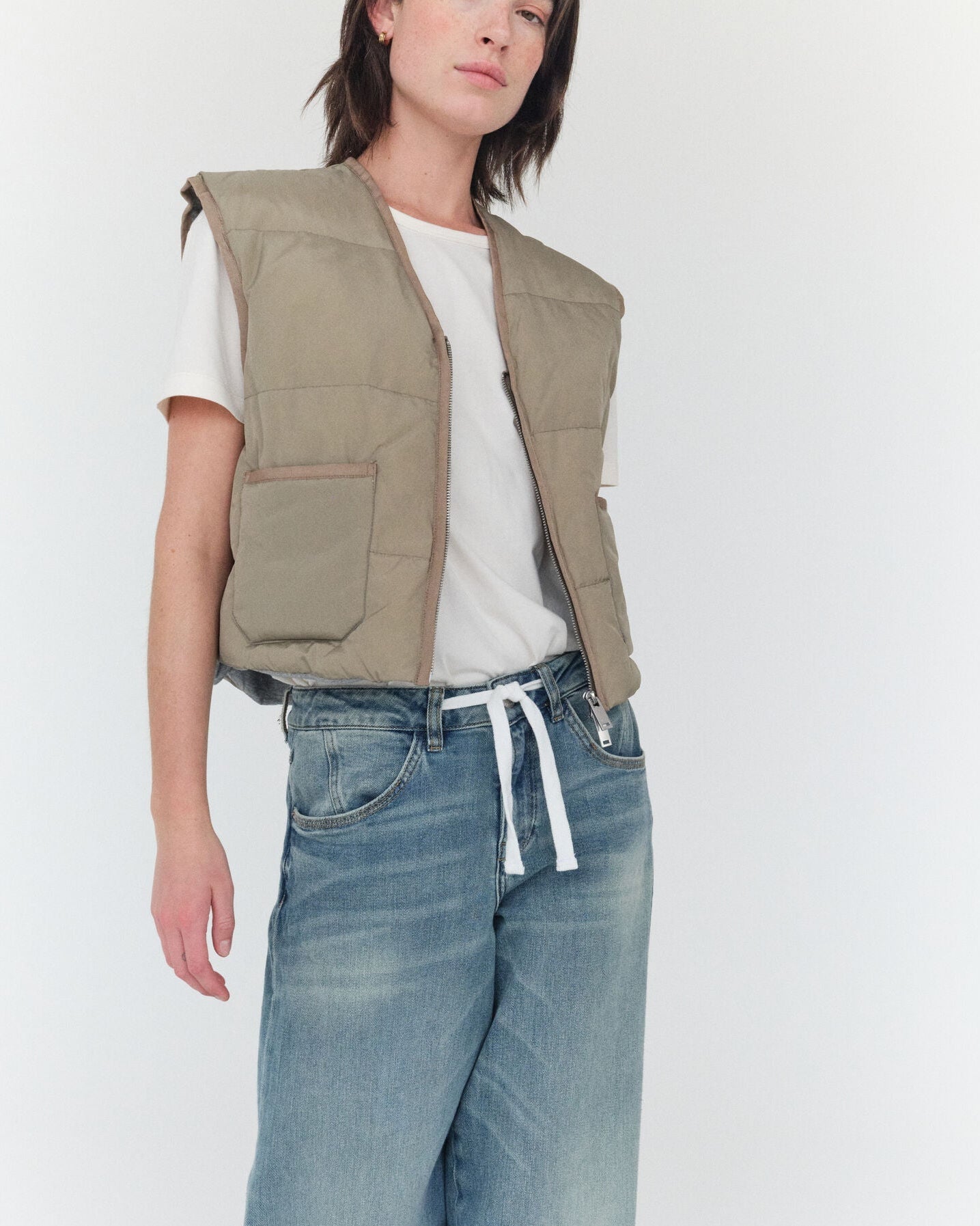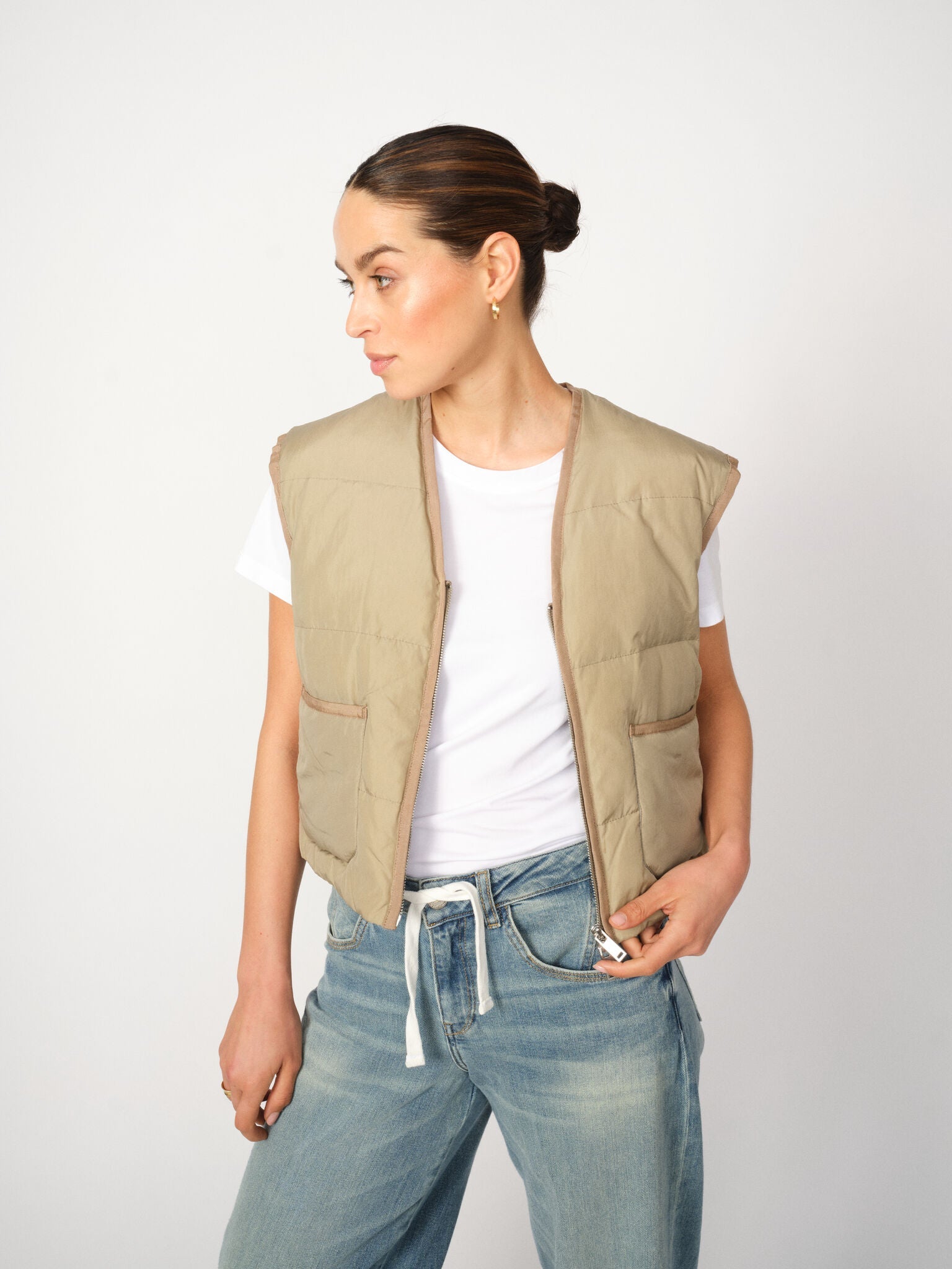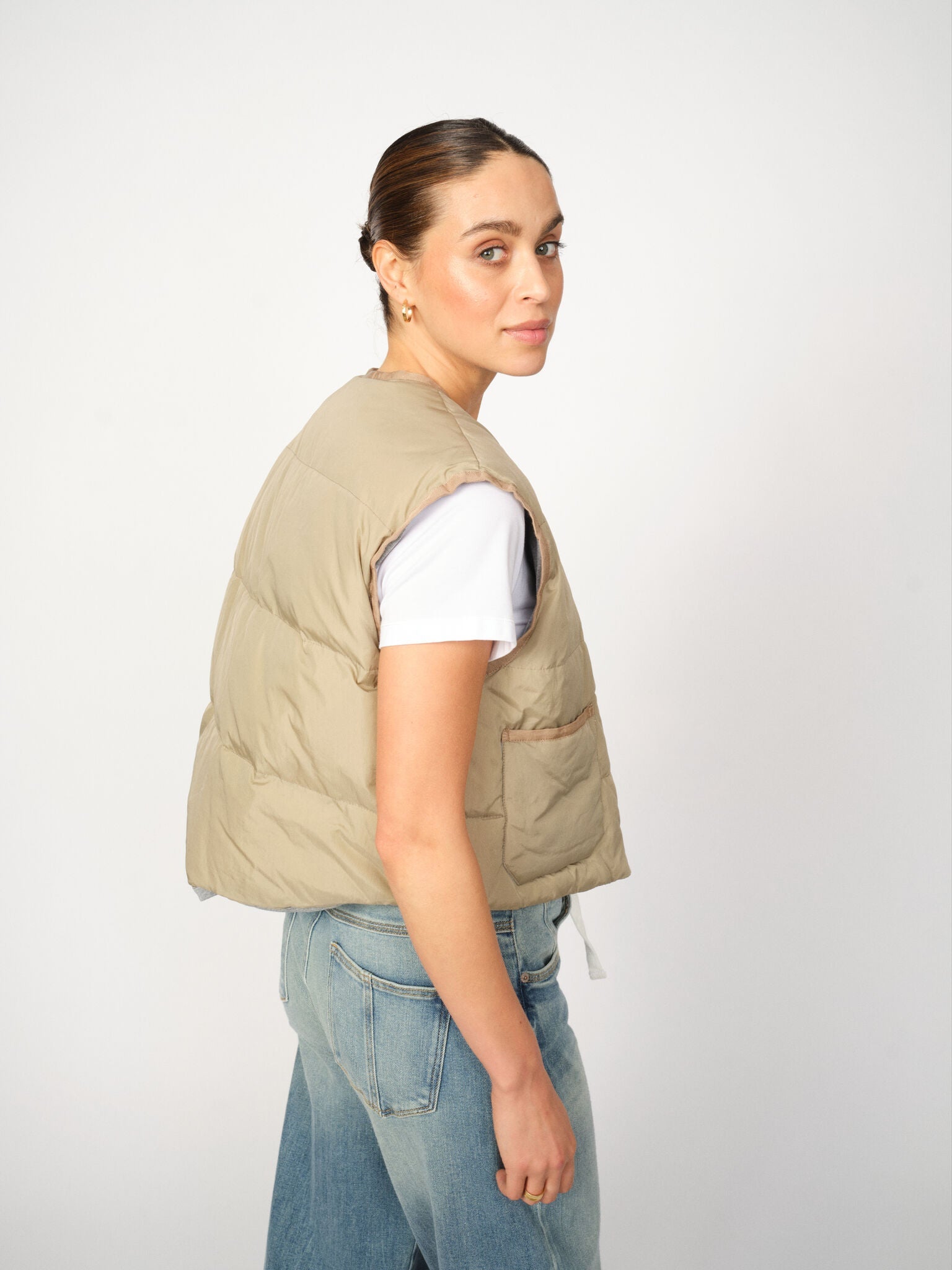 Denne vest er designet i en afslappet silhuet med en tidløs V-udskæring, som forener hverdagskomfort med et rent, moderne udtryk. Den har en praktisk lynlåslukning og funktionelle lommer. Fyldt med ansvarligt andedun, giver den let varme til køligere dage.