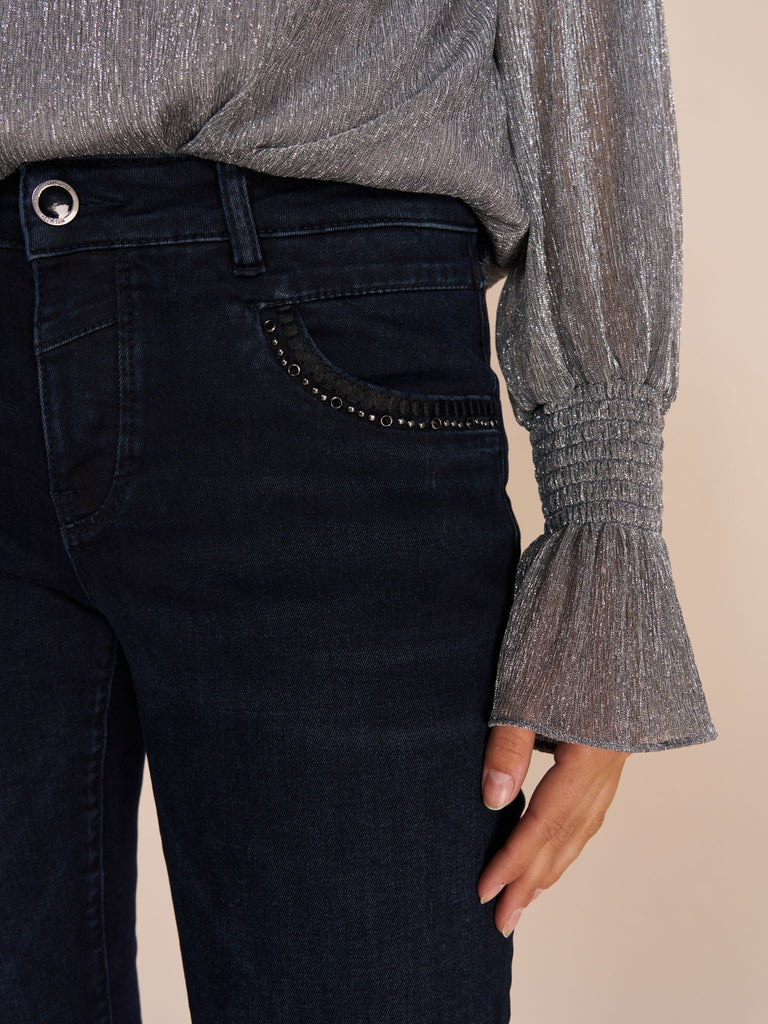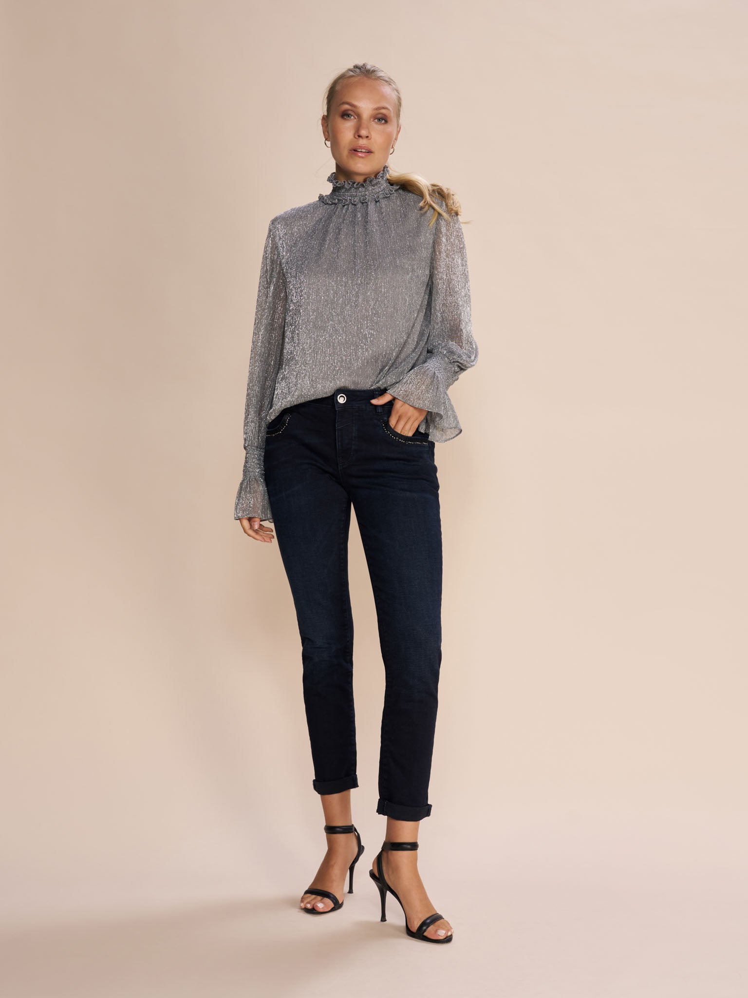 Mangler du de perfekte jeans? Så skal du ikke lede længere! Disse jeans er en af MOS MOSH' mest populære modeller. De er designet med tapered ben og høj/middel talje, så du kan sætte dem lavt på hoften eller højere oppe i taljen for et mere elegant look. Med unikke nitte-detaljer ved lommerne og cool lurex-syninger som finish. Brug dem gerne med et smart opsmøg til et par læderstøvler sammen med en go-to T-shirt og en blazer.