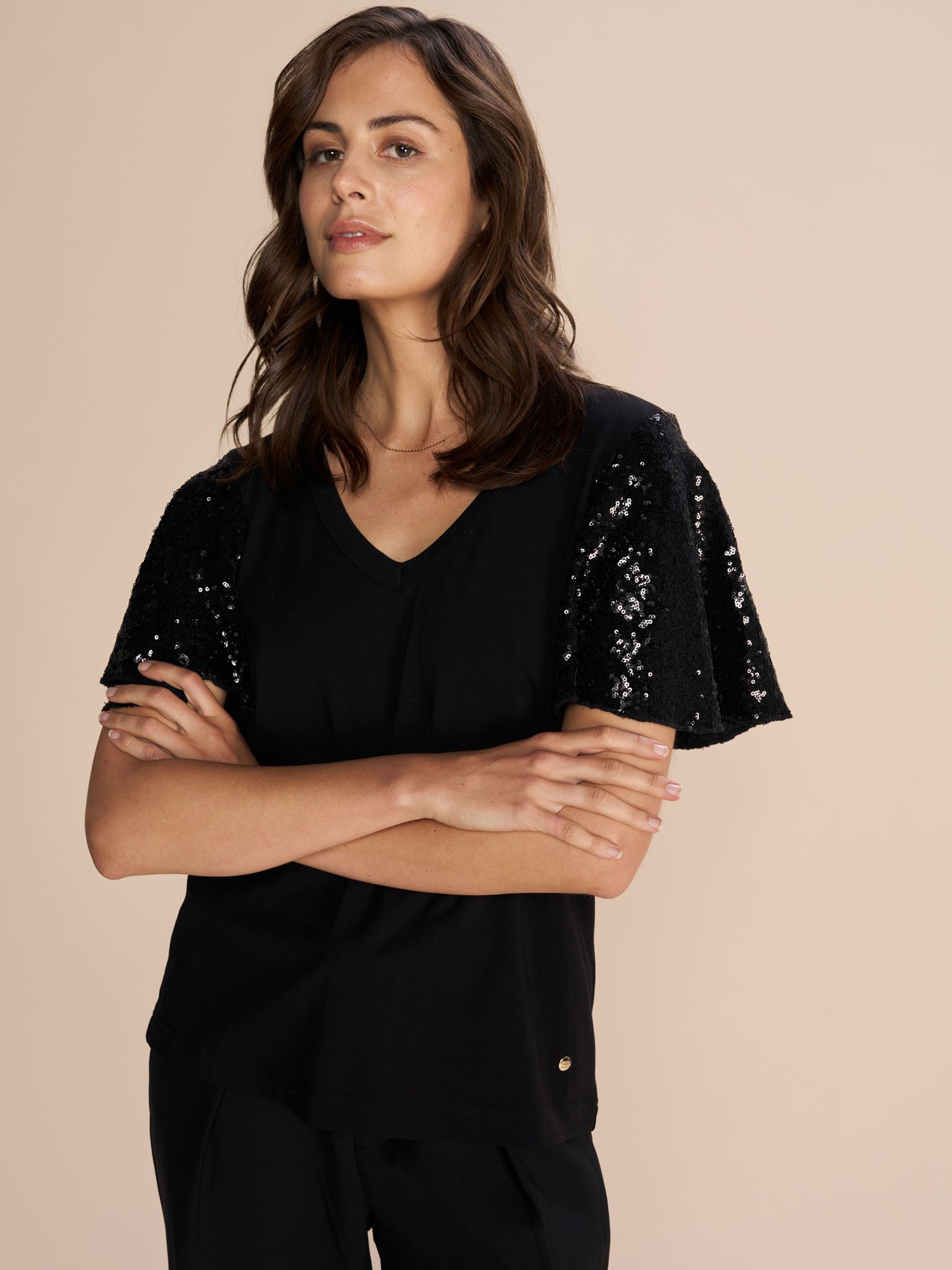 Vi elsker T-shirts med pailletter på ærmerne! Denne T-shirt er designet i en regulær silhuet og kan både bruges til jeans og tailoring, alt efter stylingbehov. Og gerne et par stiletter til en bytur med vennerne.