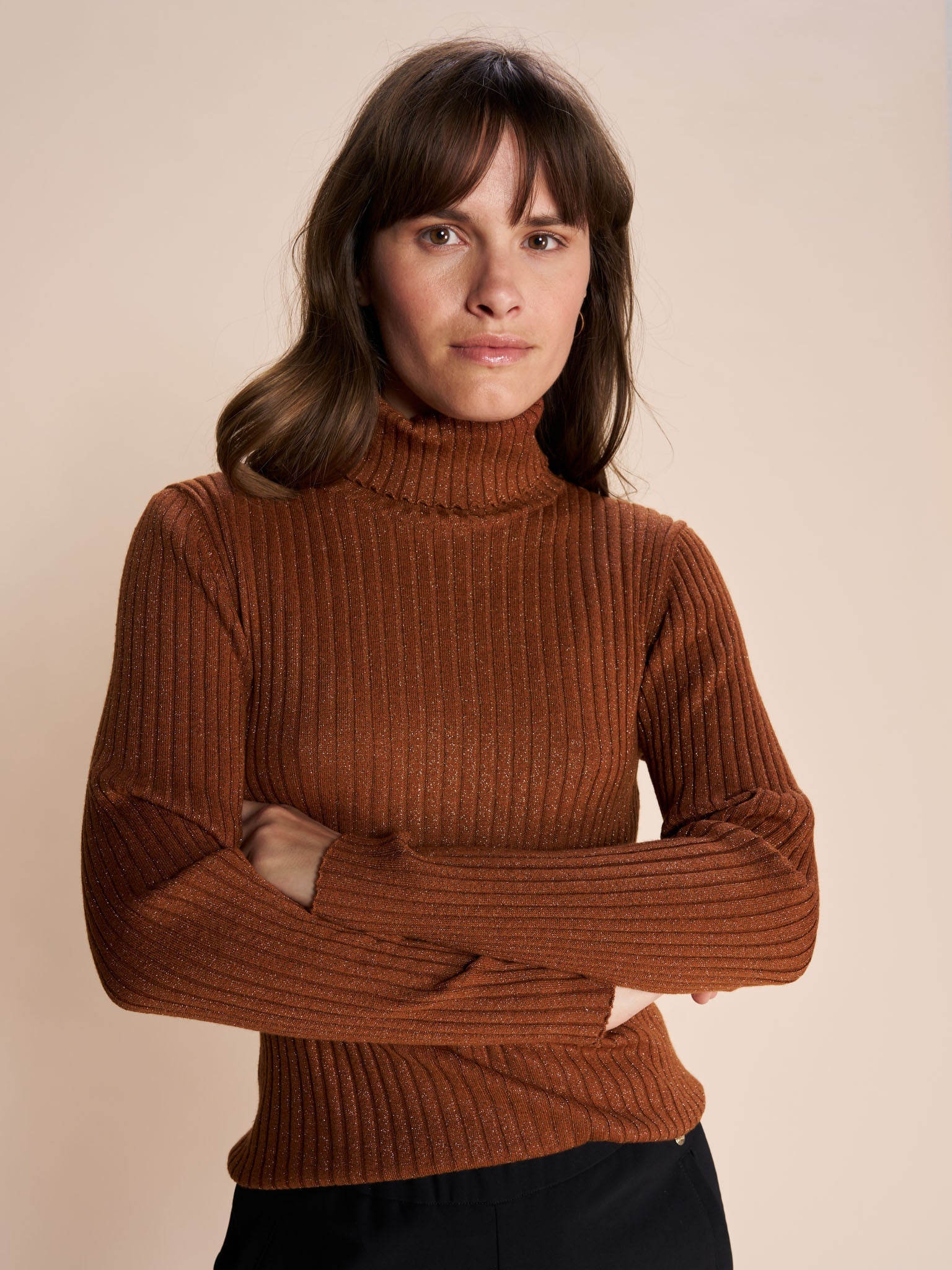 Denne trendy rullekravesweater er en tidløs klassiker! Designet i en tætsiddende silhuet og fremstillet i en uldblanding med rib- og lurex-detaljer som finish. Brug den til et par jeans for et cool hverdagslook eller til tailoring.