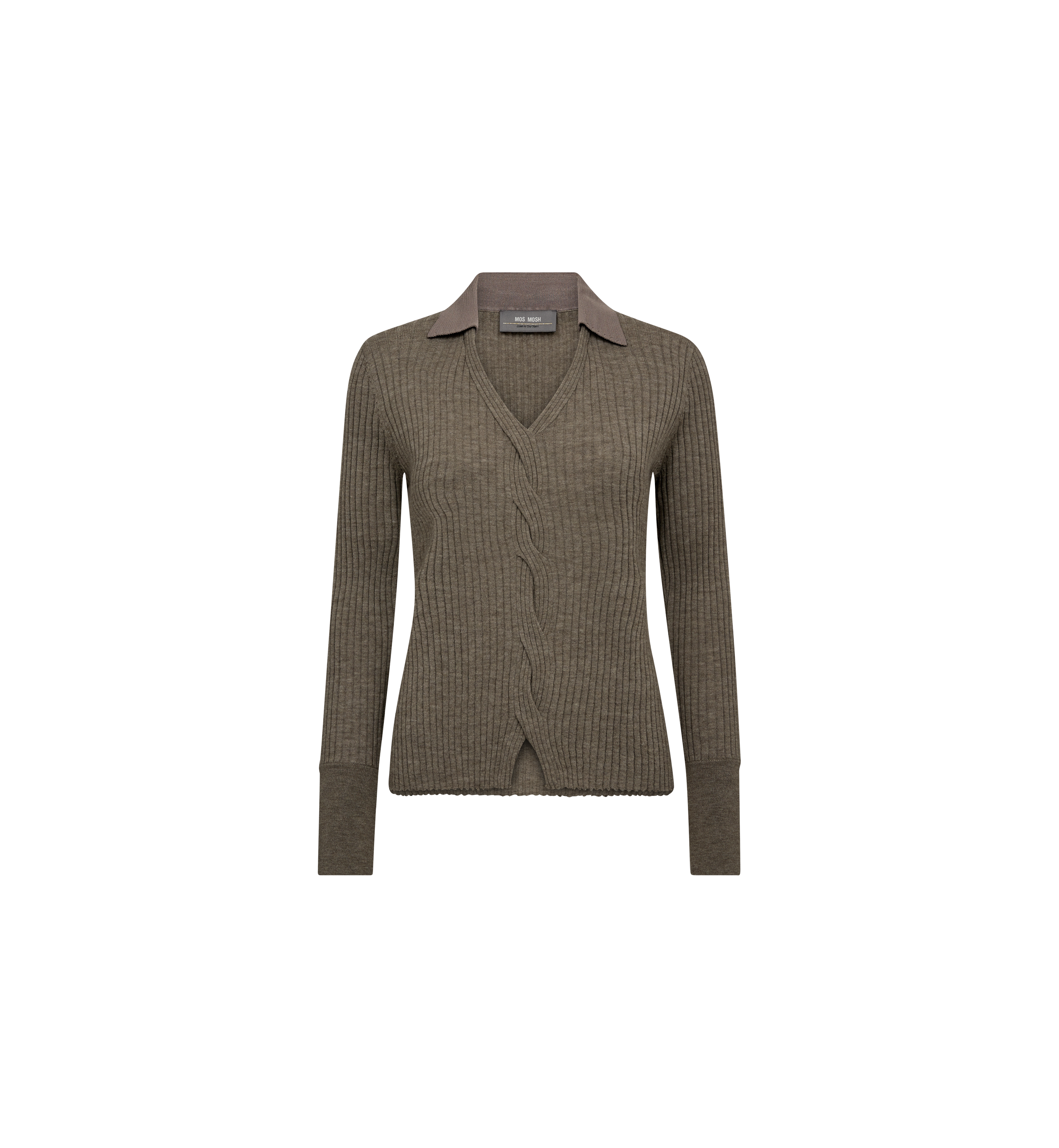 Et stilfuldt must-have i enhver garderobe. Denne trendy polo er lavet af en blød uldblanding i en flatterende regulær pasform. Den er designet med en klassisk krave, en chik V-udskæring og elegante flettede strikdetaljer foran, der tilfører et afslappet, men sofistikeret udtryk. Perfekt at style med jeans og chunky støvler for et cool look.