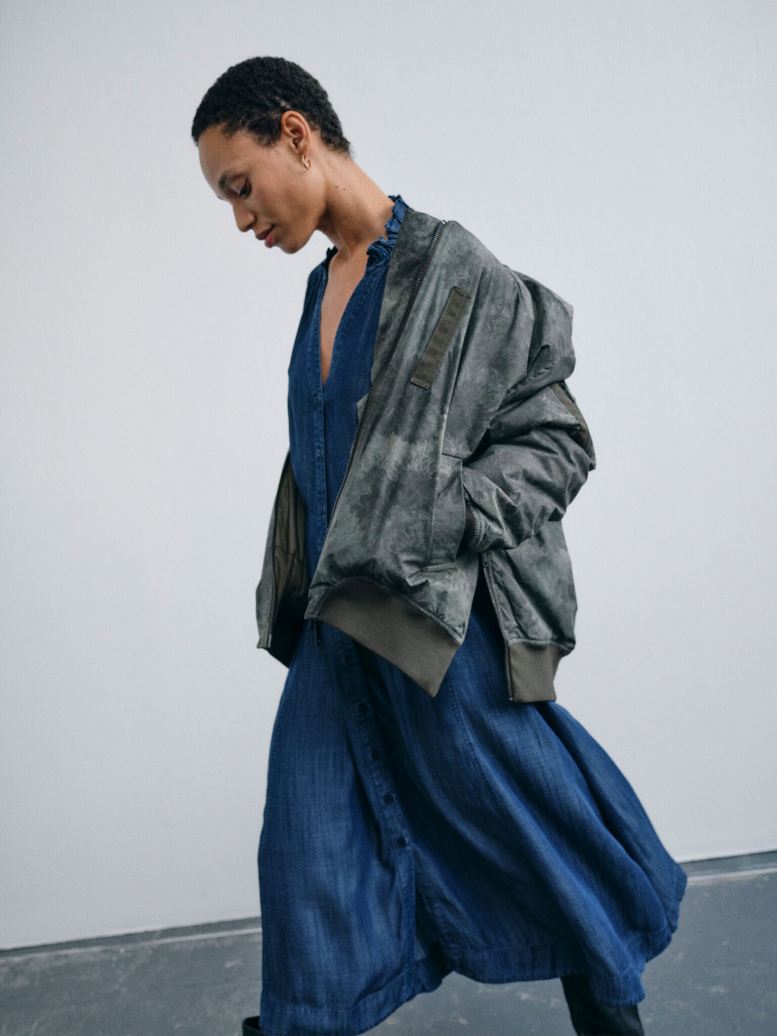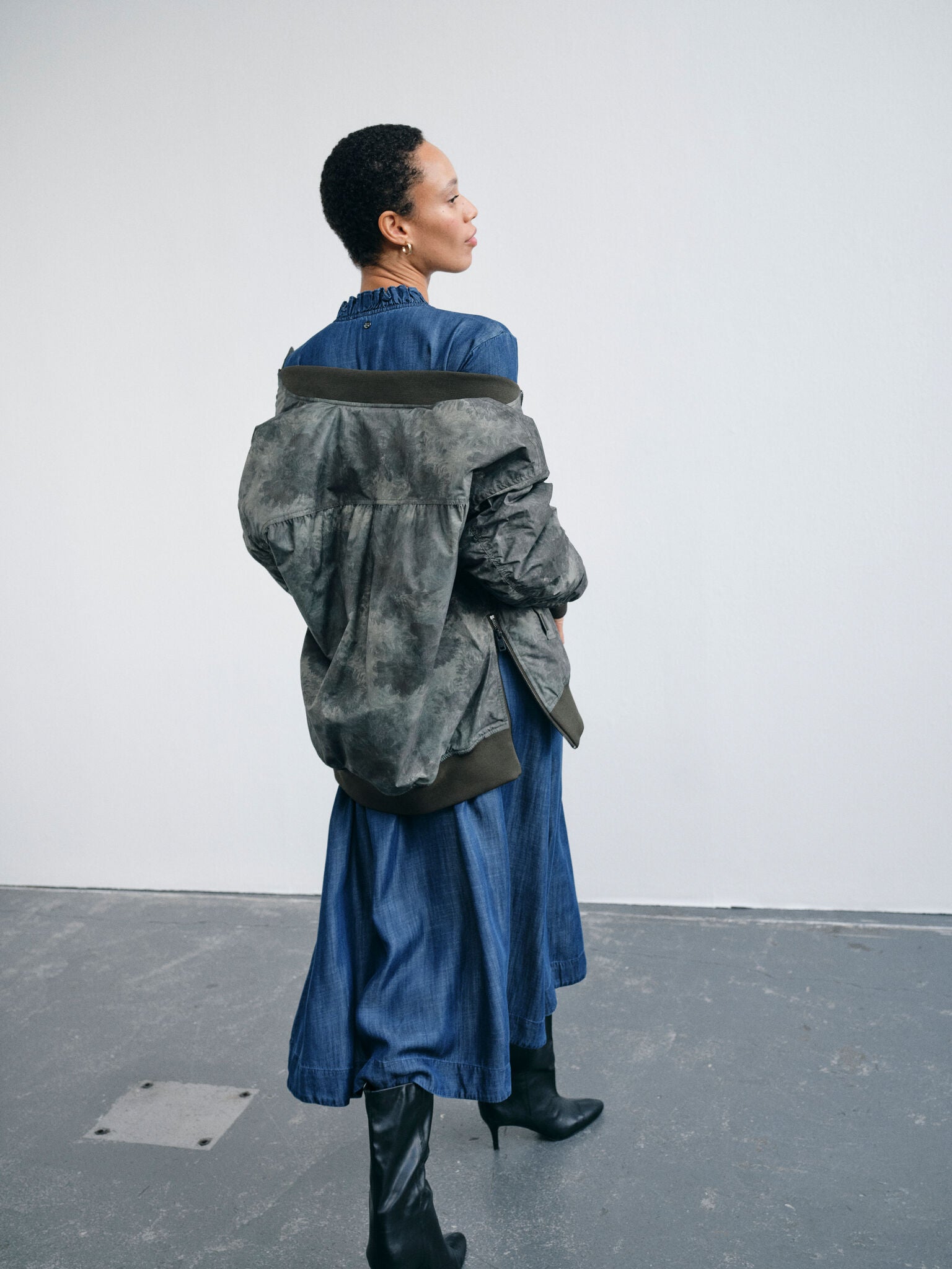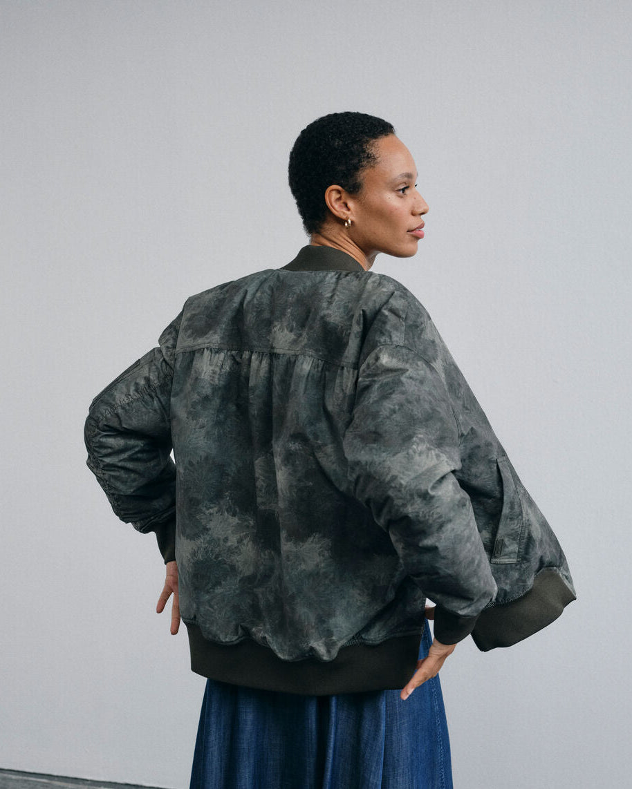 Denne oversized bomberjakke har et iøjnefaldende print og er designet med en O-hals og en synlig lynlåslukning, der giver et moderne touch. Med lange ærmer og en relaxed fit er den et alsidigt statement piece, der både kan styles over simple basics eller med wide-leg bukser for et cool look.