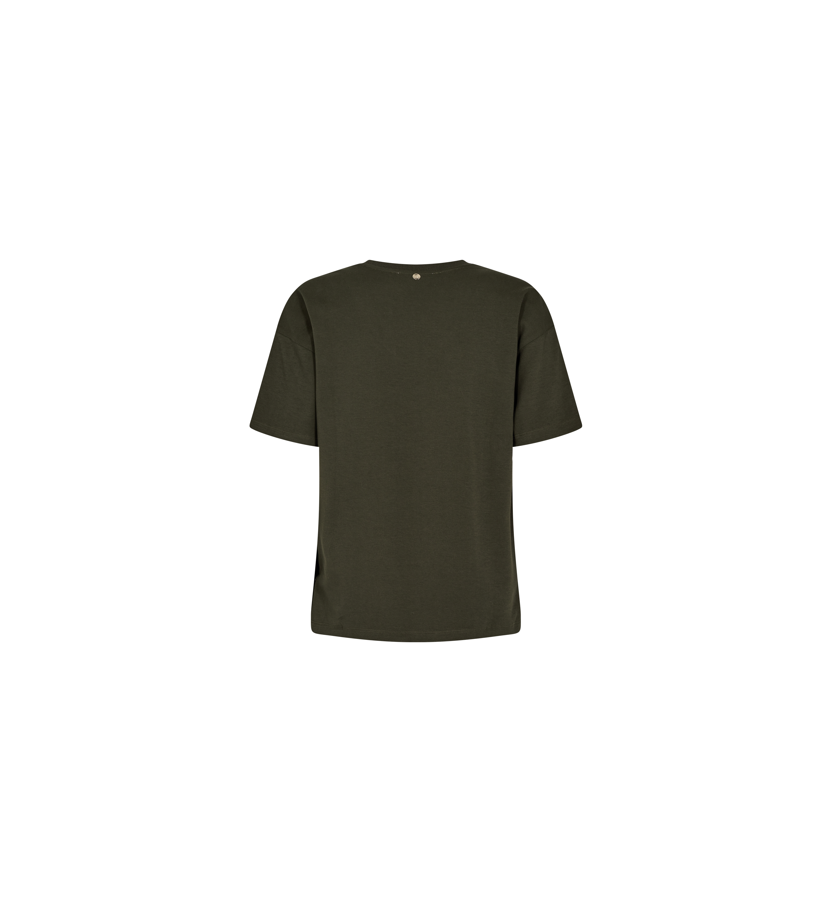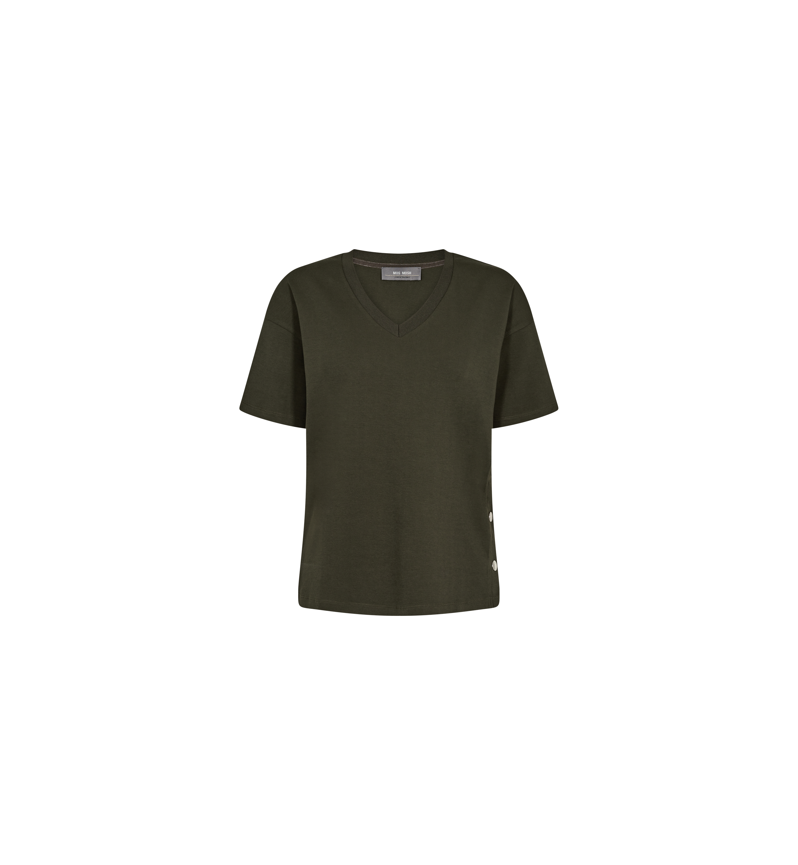 Flatterende T-shirt med en flot V-hals. Denne skønne T-shirt er fremstillet i en bomuldsblanding og designet i en let løs silhuet. Passer til stort set alle dine yndlingsstyles – f.eks. et par jeans eller tailoring.