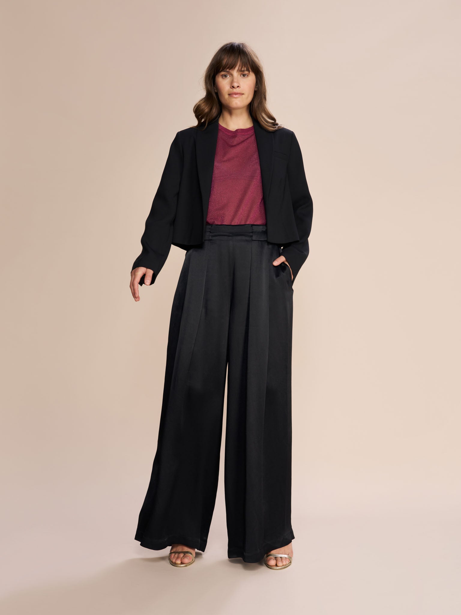Flotte bukser i skinnende kvalitet designet i en wide-leg-pasform med middel talje og lang længde. Med bløde plisseringer og elastisk linning som finish. Style dem med en go-to T-shirt eller en klassisk skjorte.