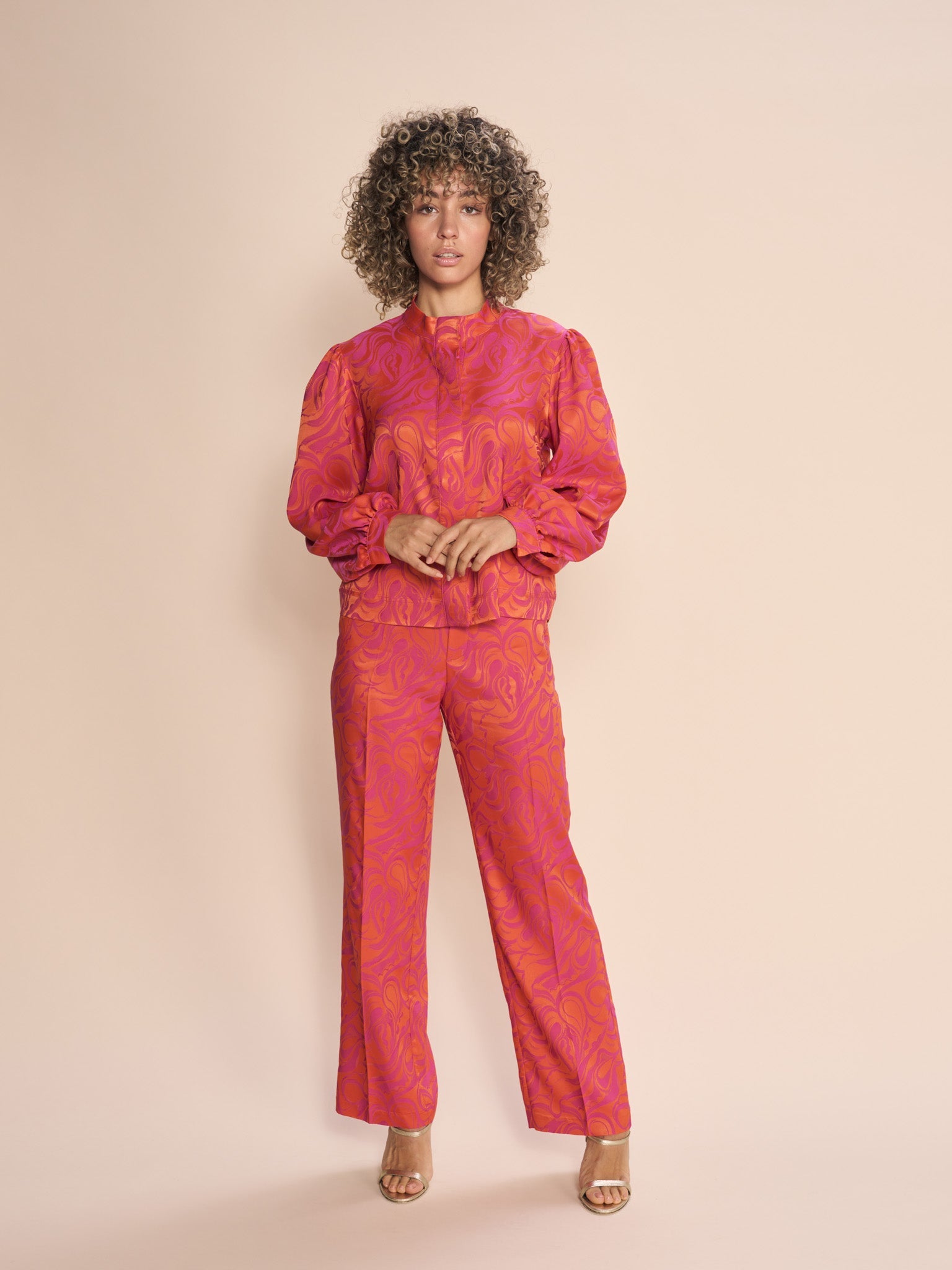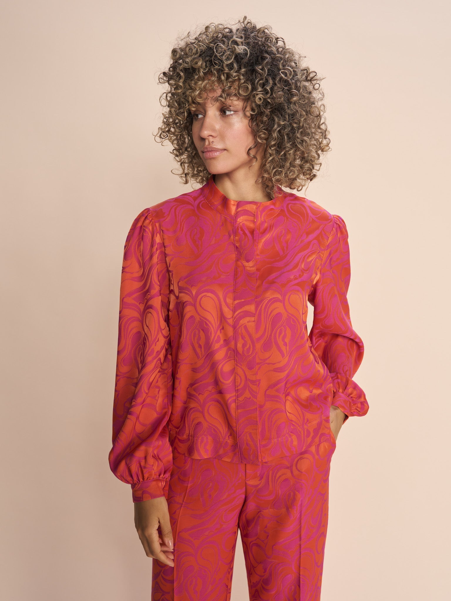 Denne trendy skjorte er designet i et fantastisk jacquard-mønster med en flot kombination af to farver og inspireret af de nostalgiske 70'ere. Fremstillet i en blød viskoseblanding og designet i en løs silhuet. Med mandarinkrave, bløde plisseringer og skjult knaplukning som finish. Brug den sammen med vores matchende bukser for et fuldendt cool look.
