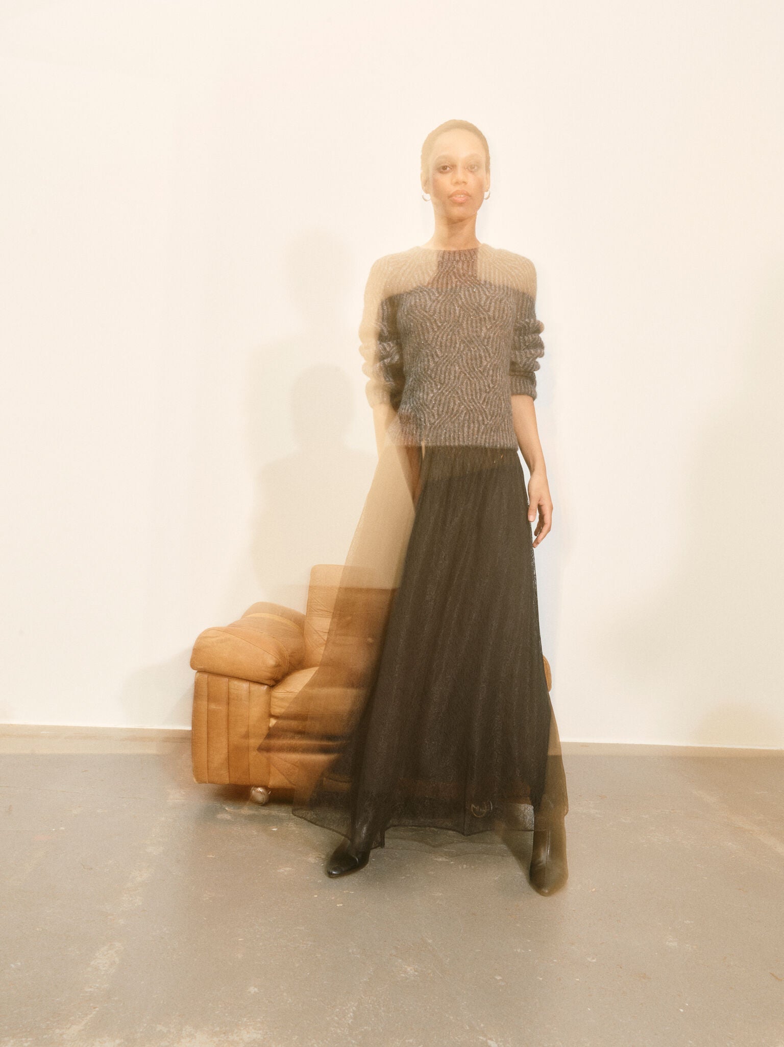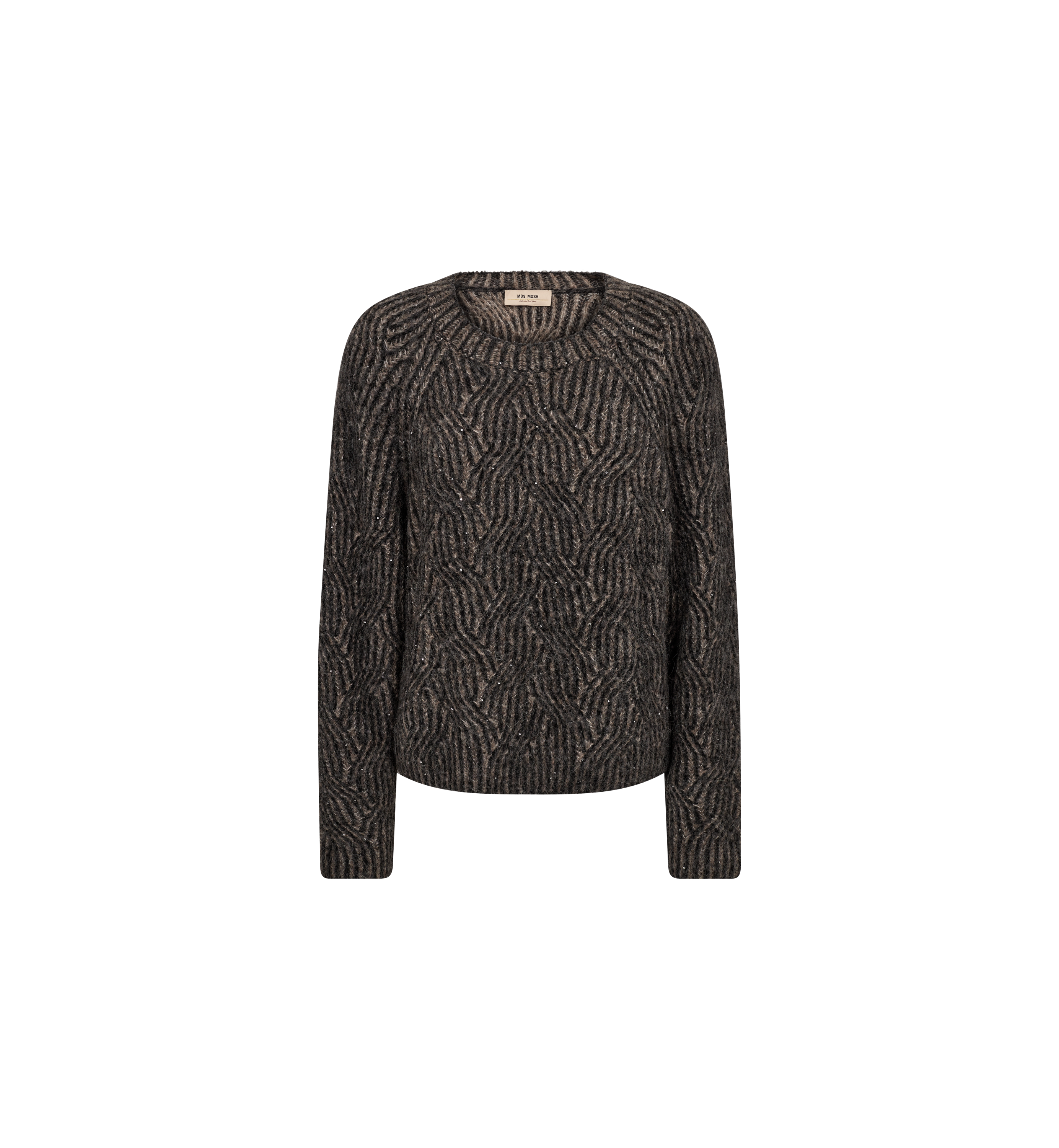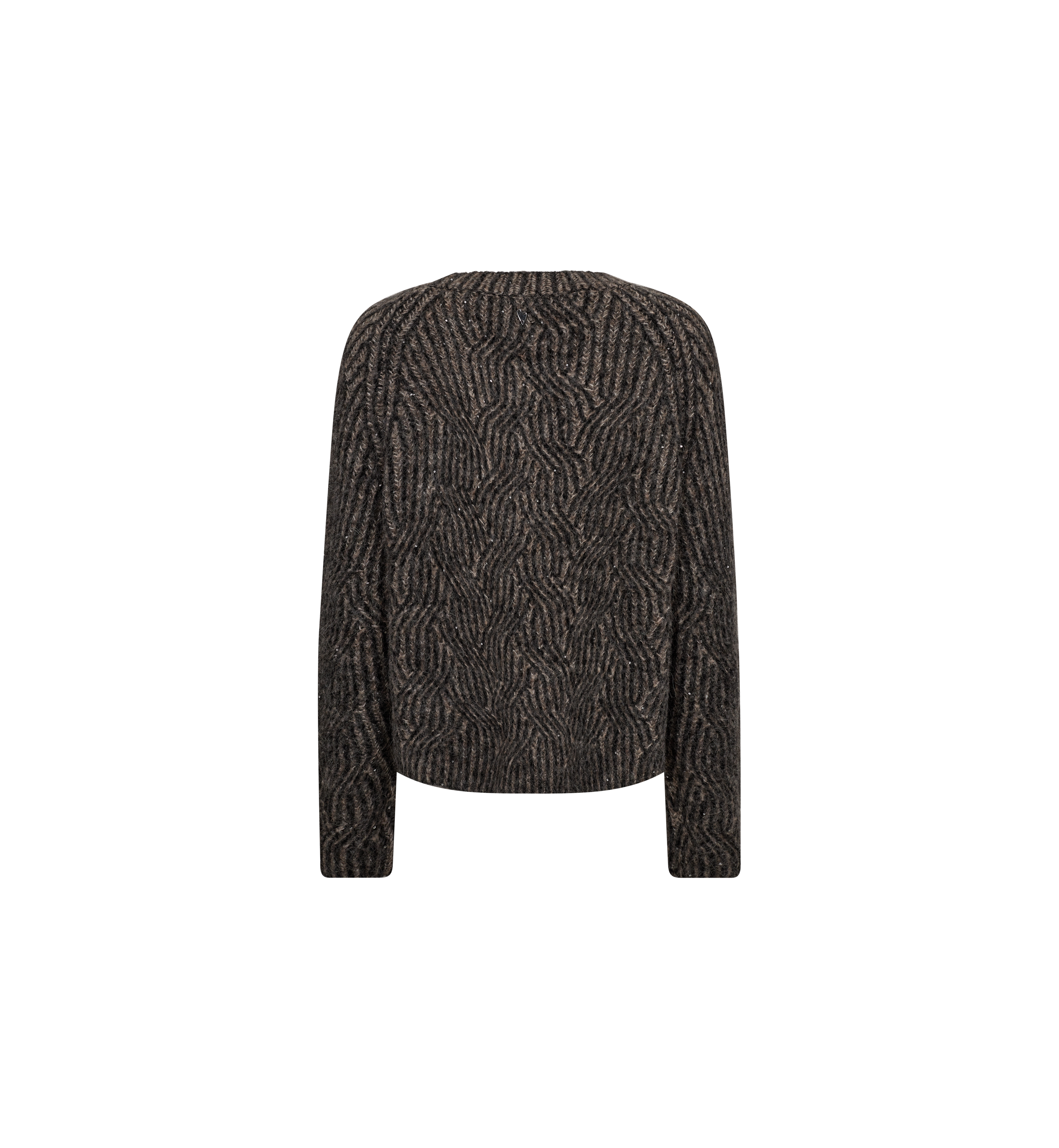 Denne striktrøje forener komfort med diskret glamour. Den er fremstillet i et blødt, kraftigt garn med et markant, tekstureret mønster og har fine pailletter vævet ind, som fanger lyset, hver gang du bevæger dig. Den afslappede pasform og klassiske rund halsudskæring gør den nem at style, mens den dybe, mørke farve tilfører både dybde og elegance. Perfekt til at løfte dit hverdagslook eller til at lægge lag på lag på kølige dage med et strejf af glans.
