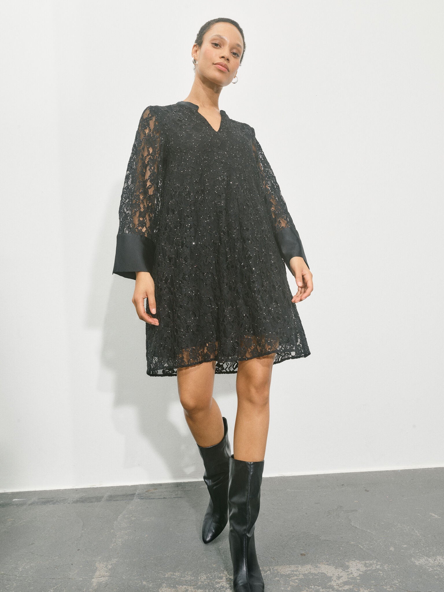 Denne kjole er skabt til øjeblikke, hvor kun det helt særlige er godt nok. Den er fremstillet i fin blomsterblonde og dekoreret med glitrende pailletter, hvilket giver den perfekte balance mellem elegance og glamour. Den flatterende V-udskæring, de let gennemsigtige ærmer og satinmanchetterne tilføjer et raffineret touch, mens den afslappede silhuet sikrer komfort og bevægelsesfrihed._x000D_